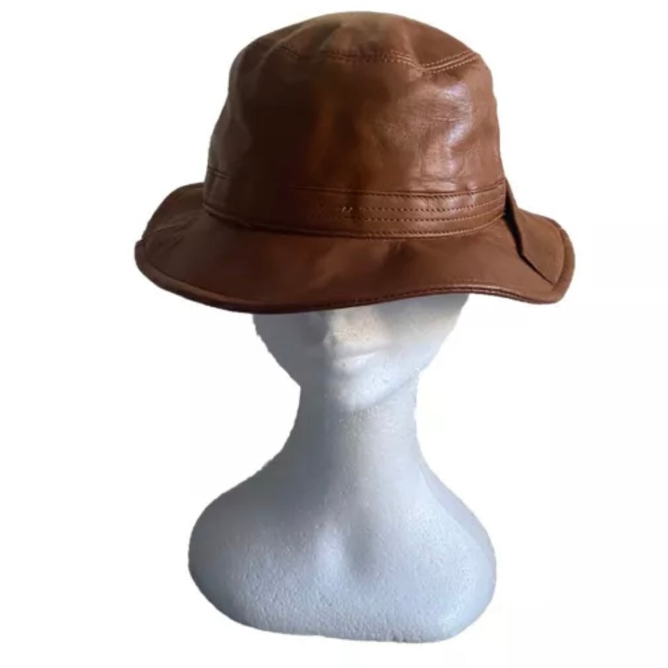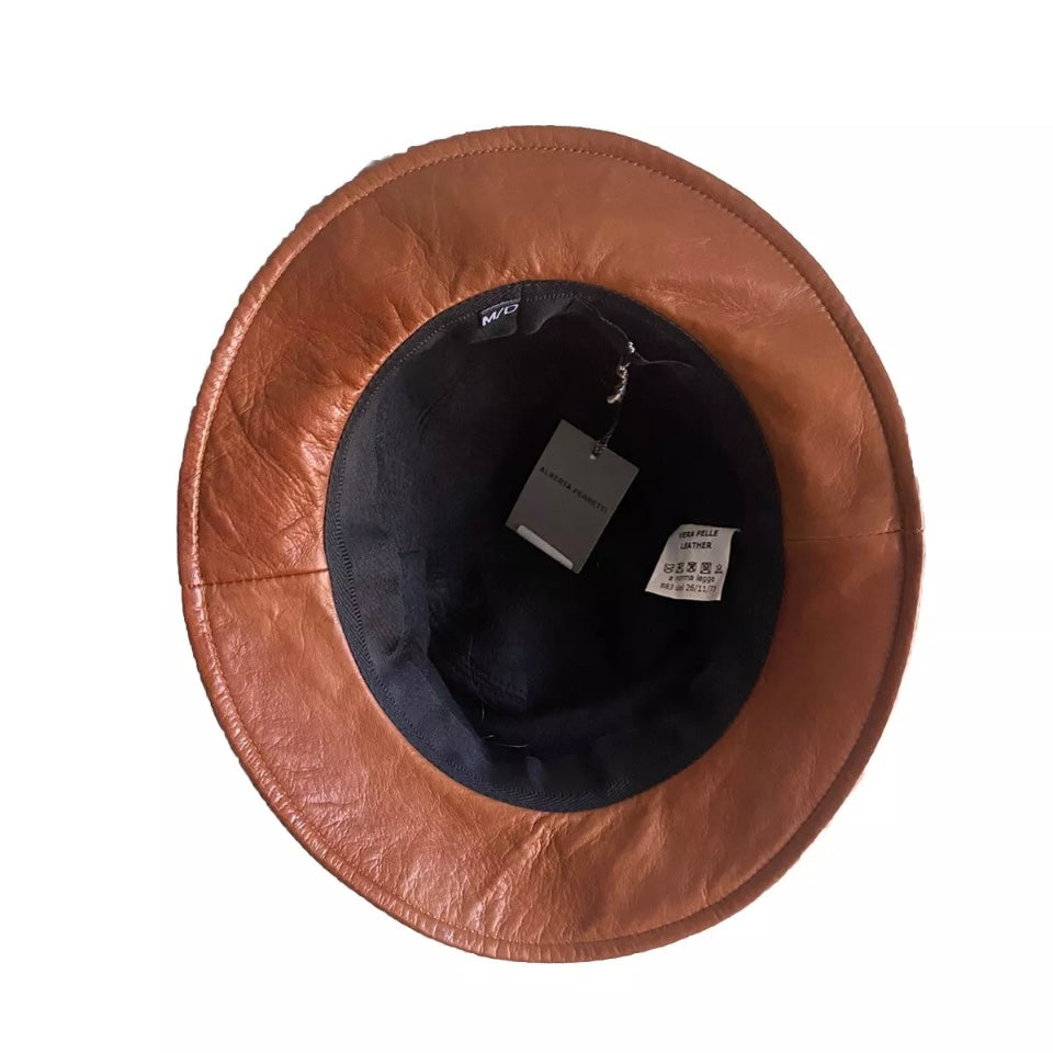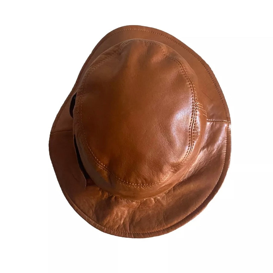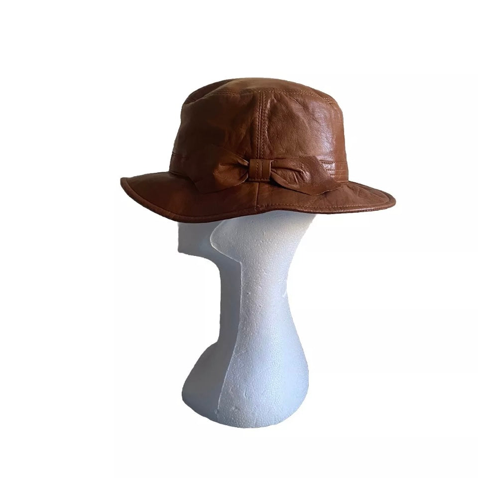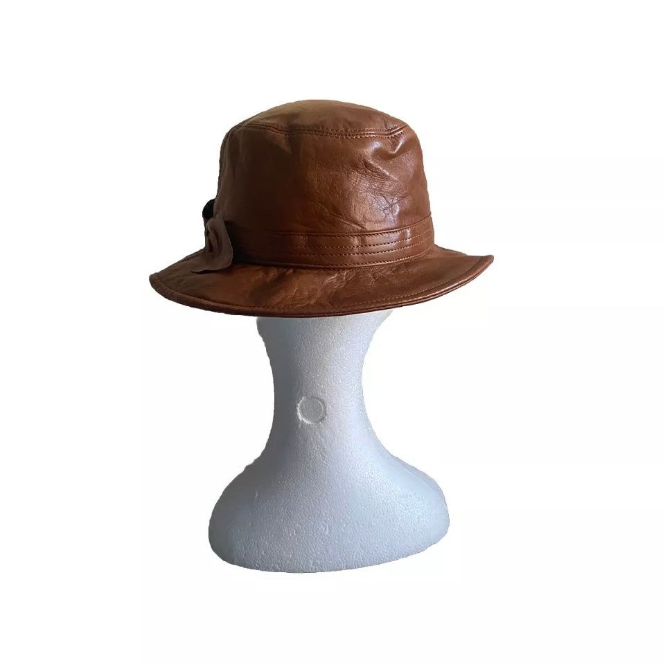 Bellissimo cappello modello pescatore in vera pelle color tabacco da donna con fiocco laterale.