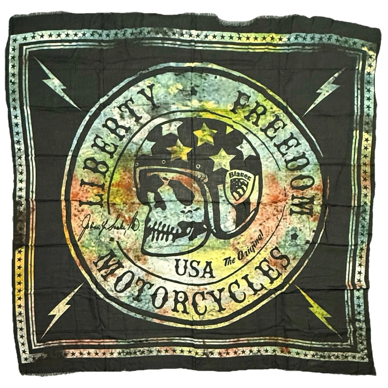 BLAUER sciarpa con un design che incorpora il logo "Blauer" e un'illustrazione di un teschio con un casco, circondato dalle parole "LIBERTY", "FREEDOM" e "MOTORCYCLES USA".