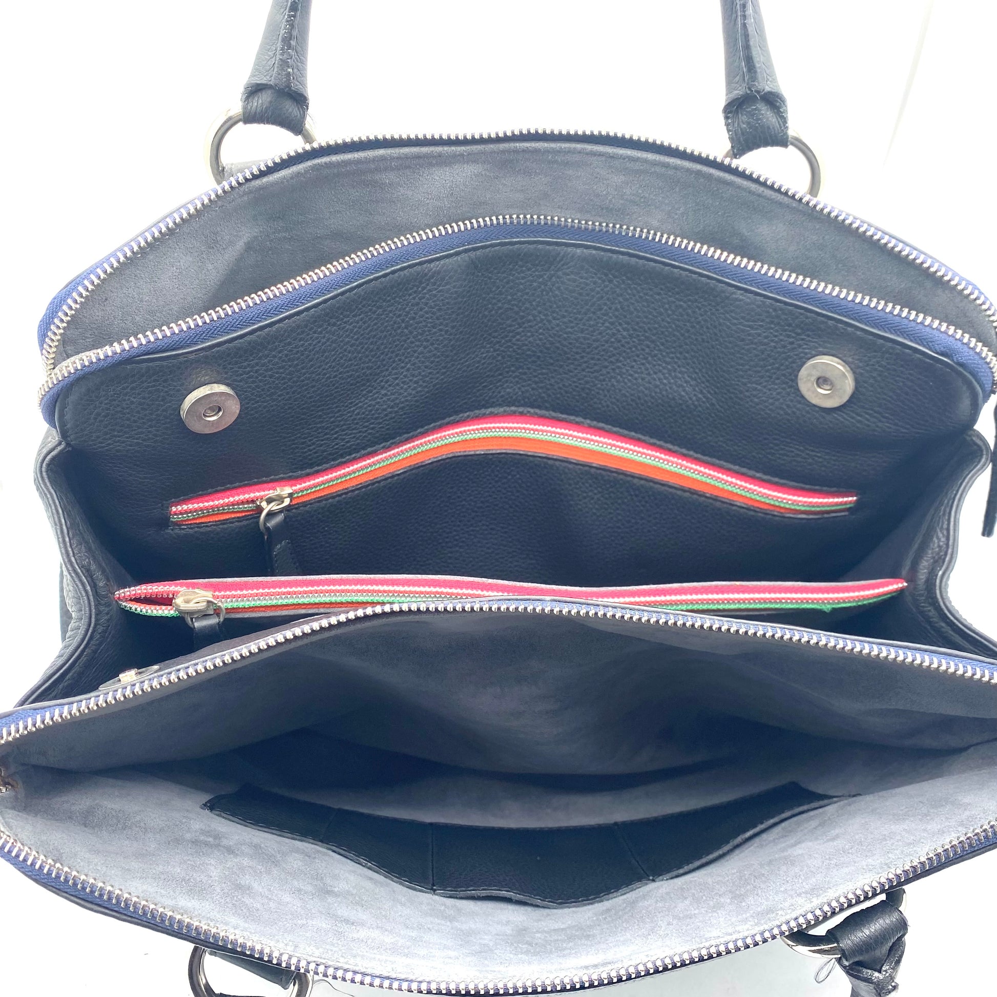 I Doppi manici permettono di indossarla comodamente a mano o a spalla. Borsa divisa in 3 parti, due parti laterali foderate in pelle scamosciata chiuse con cerniera e internamente ha tasche aperte, La parte centrale è chiusa con doppio bottone magnetico ha spaziosi interni ha tre tasche porta tutto due chiuse con zip.