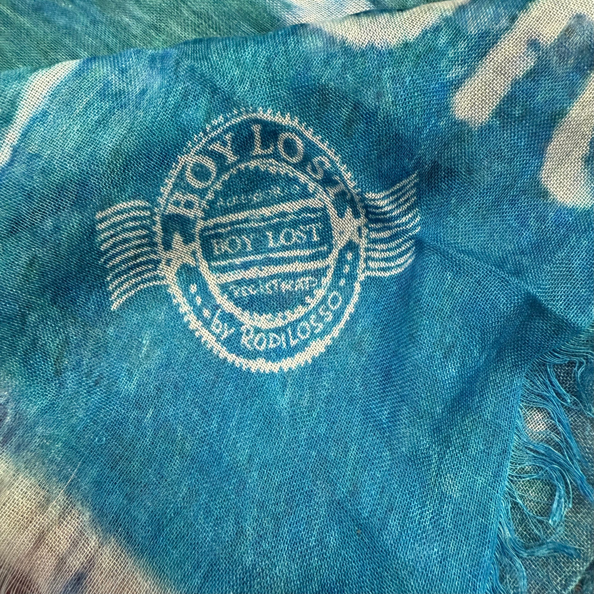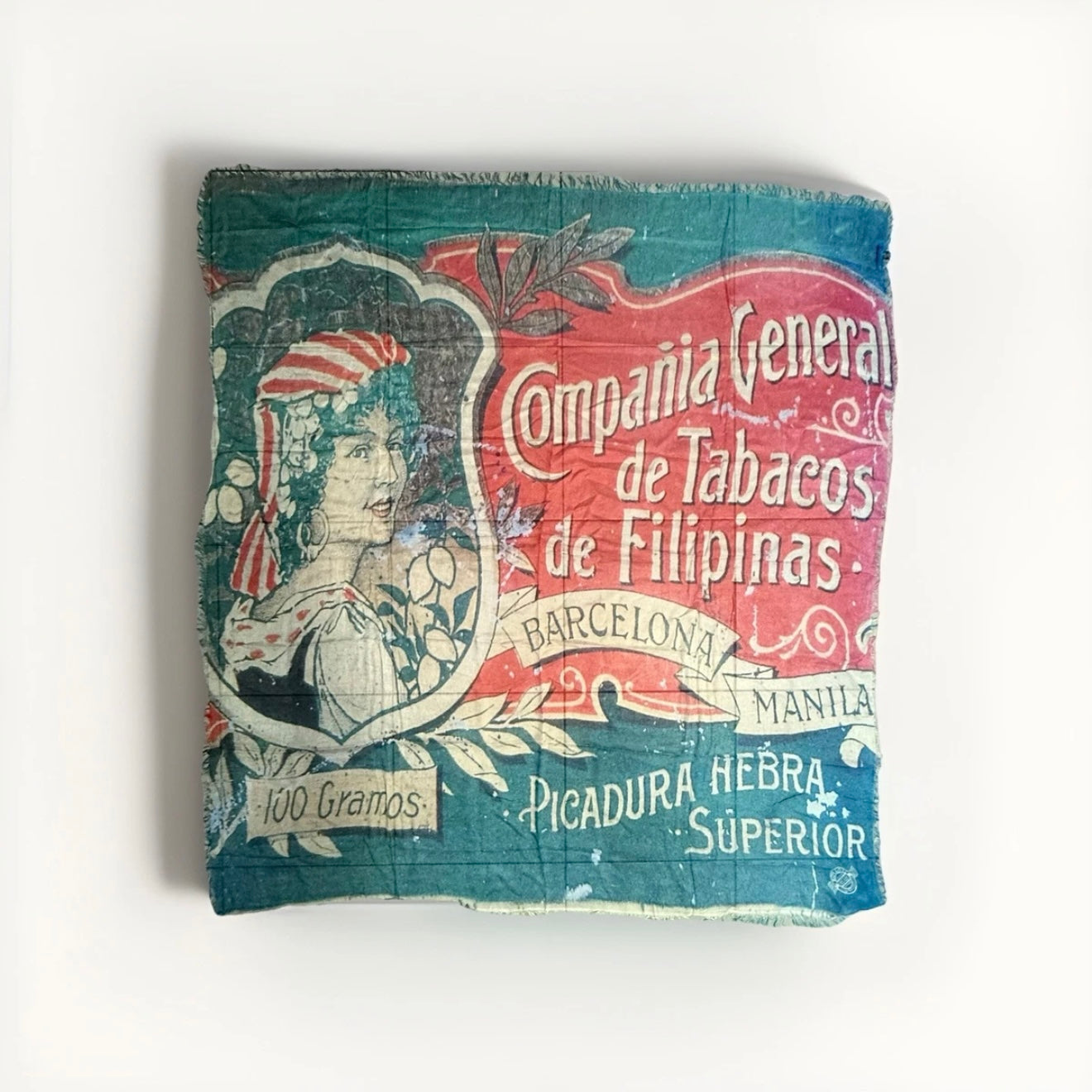 Sciarpa rettangolare multicolore con la riproduzione di un'etichetta pubblicitaria d'epoca per tabacco, con frange.