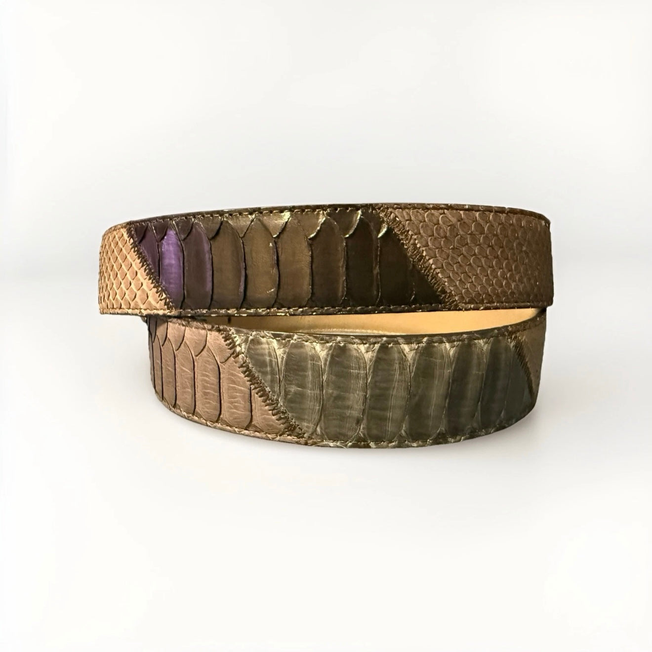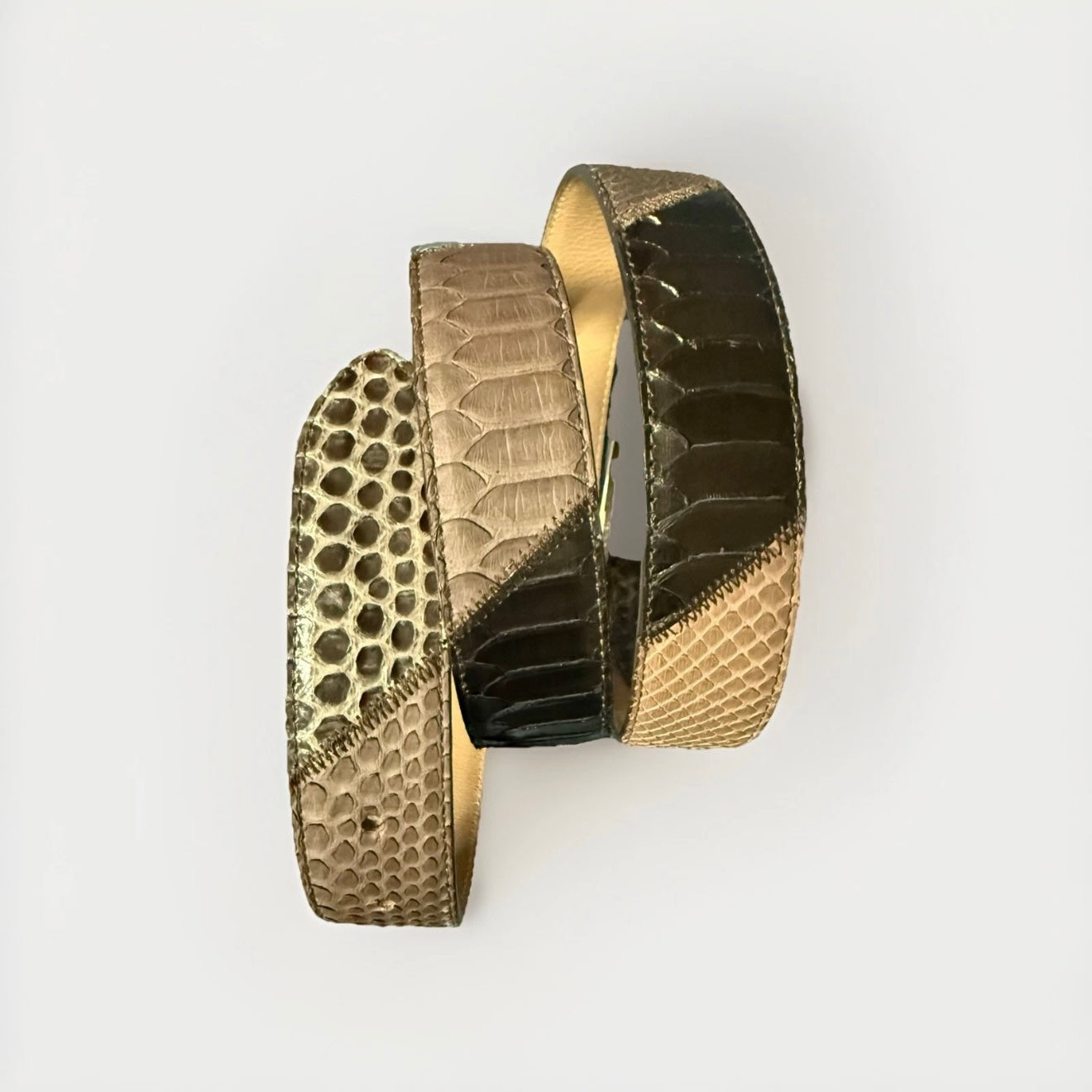 Cintura artigianale realizzata in vera pelle di pitone, con un design patchwork unico.