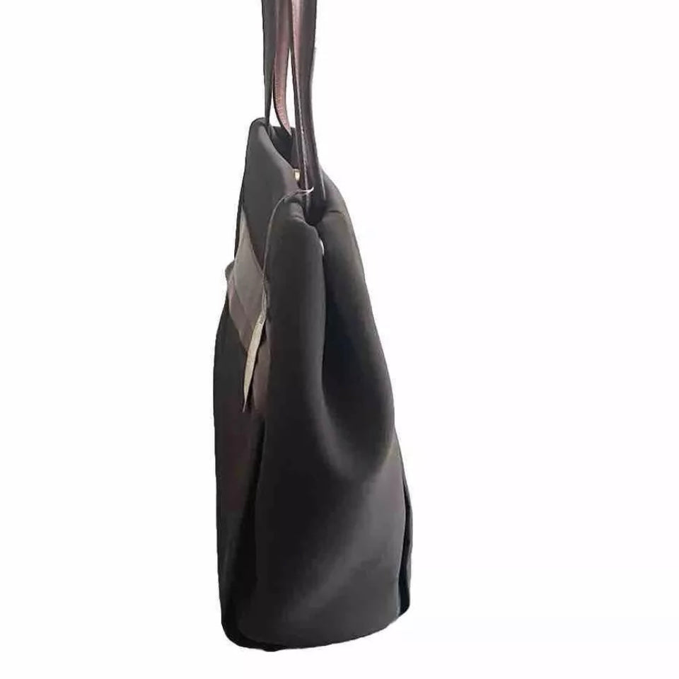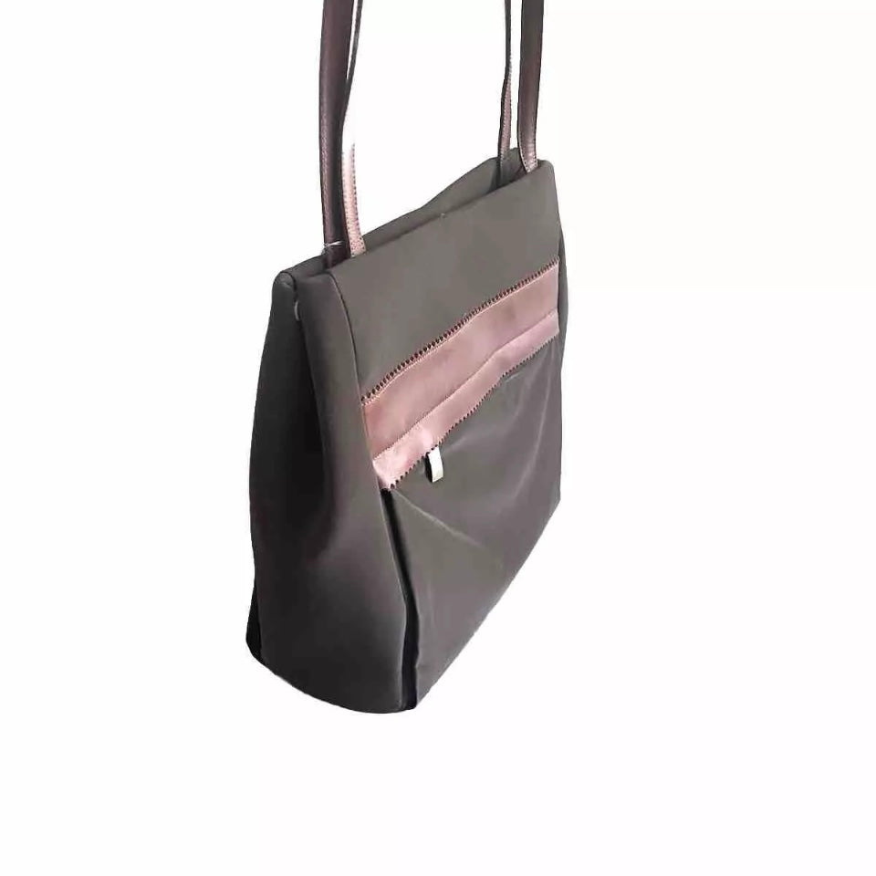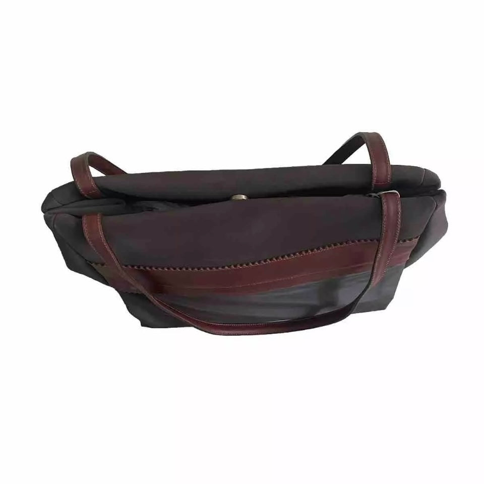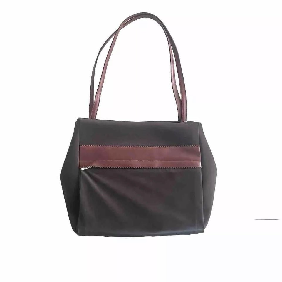 Shopping bag artigianale da spalla in tessuto tecnico impermeabile e parti in vera pelle di colore marrone