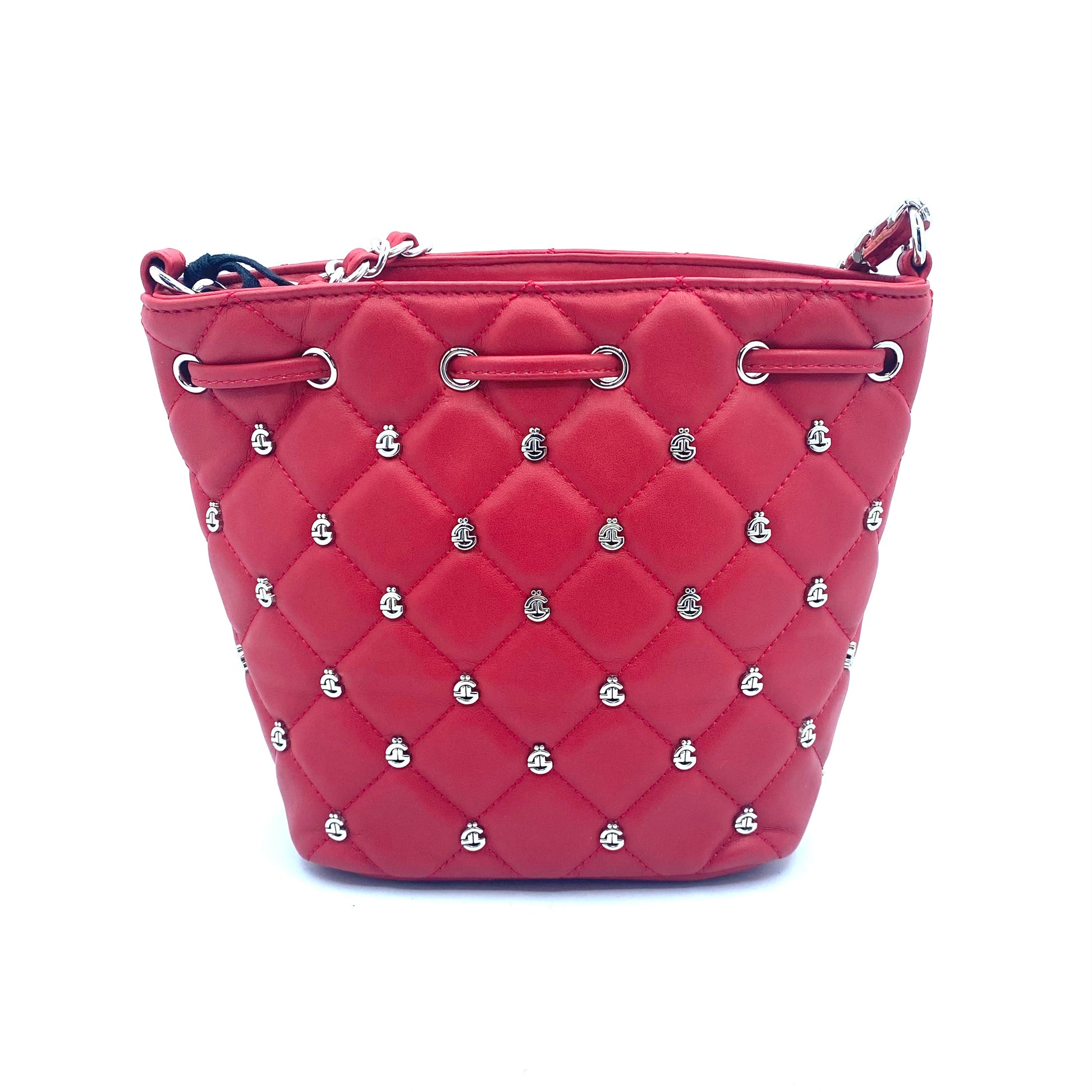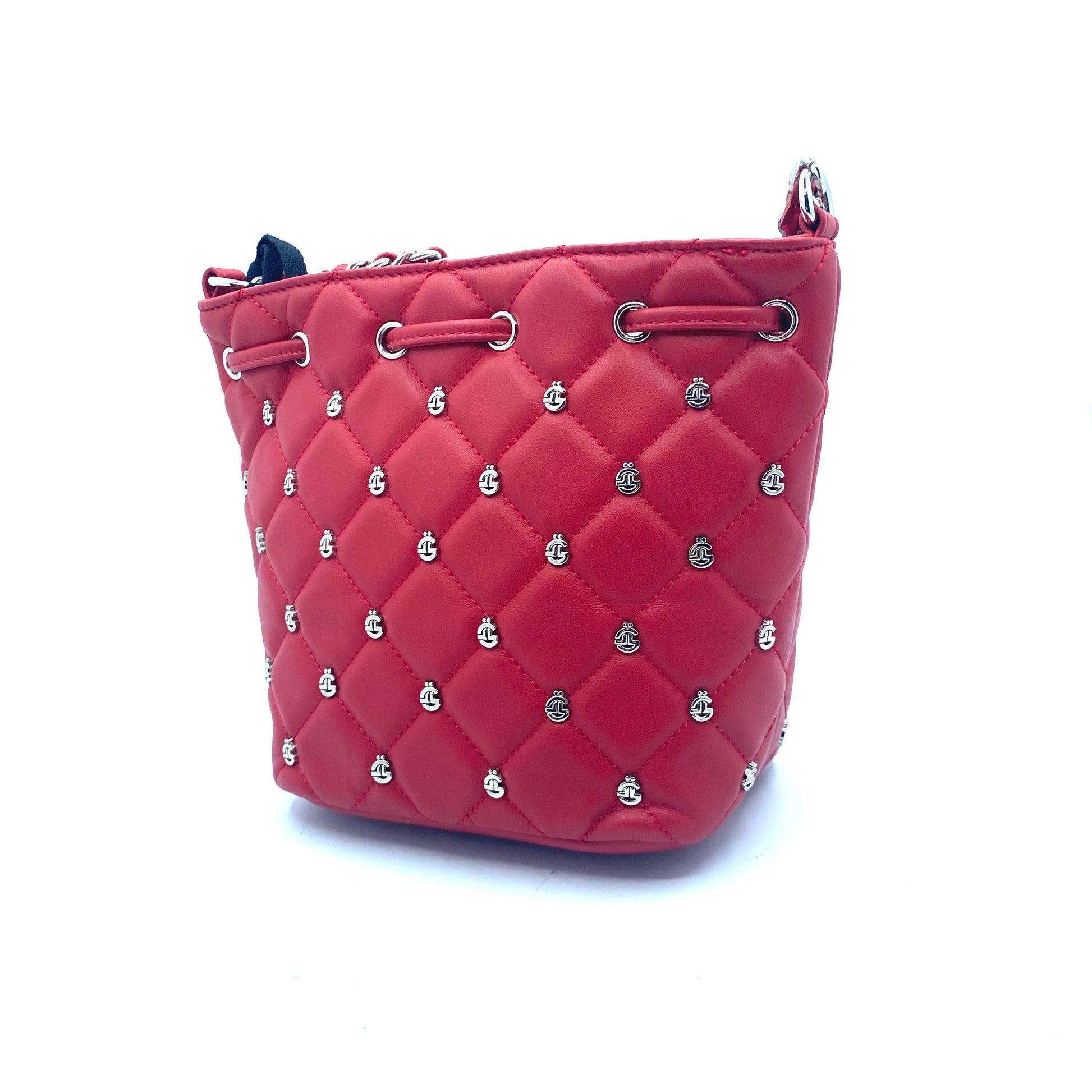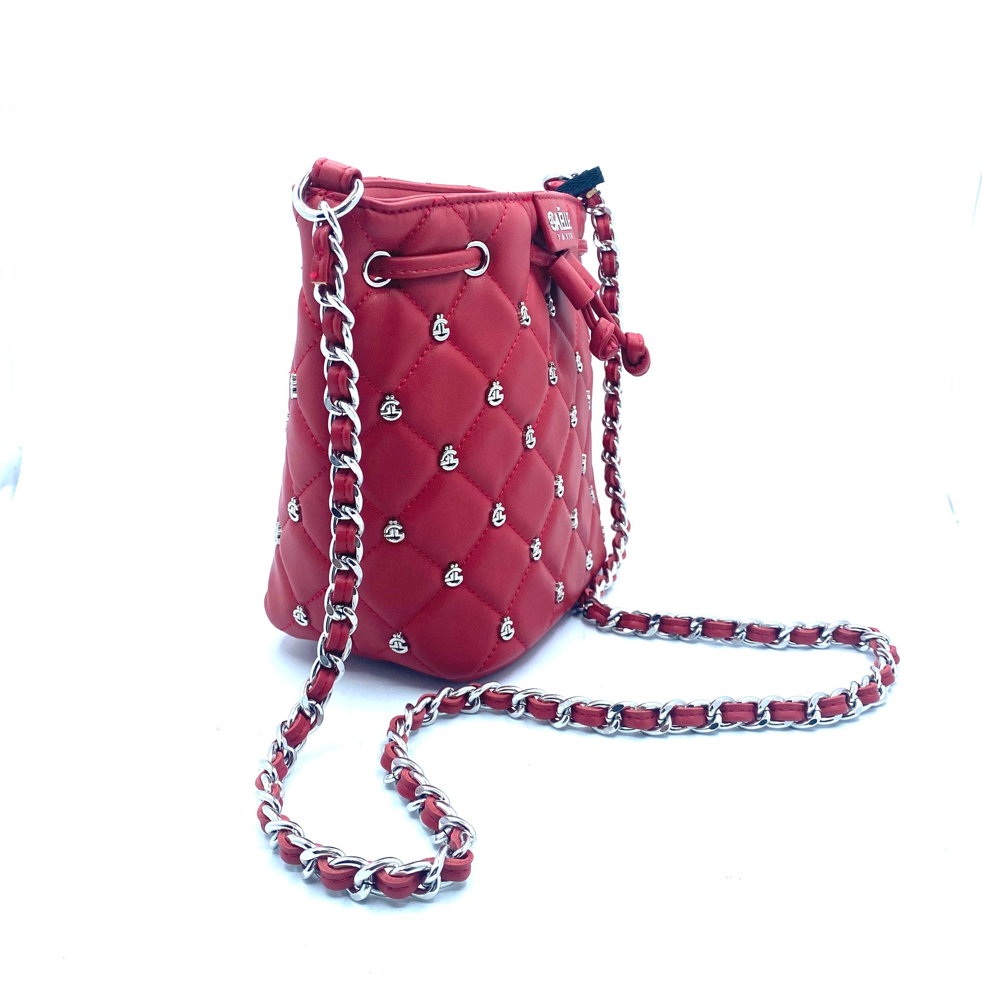 Secchiello in ecopelle con borchie lettere in metallo Gaëlle, raffinata, elegante e compatta tracollina in similpelle trapuntata, con piccole borchie applicate, tracolla con spezzoni in catena dorata e chiusura con coulisse. L'interno è spazioso, foderato e completo di tasca con zip.