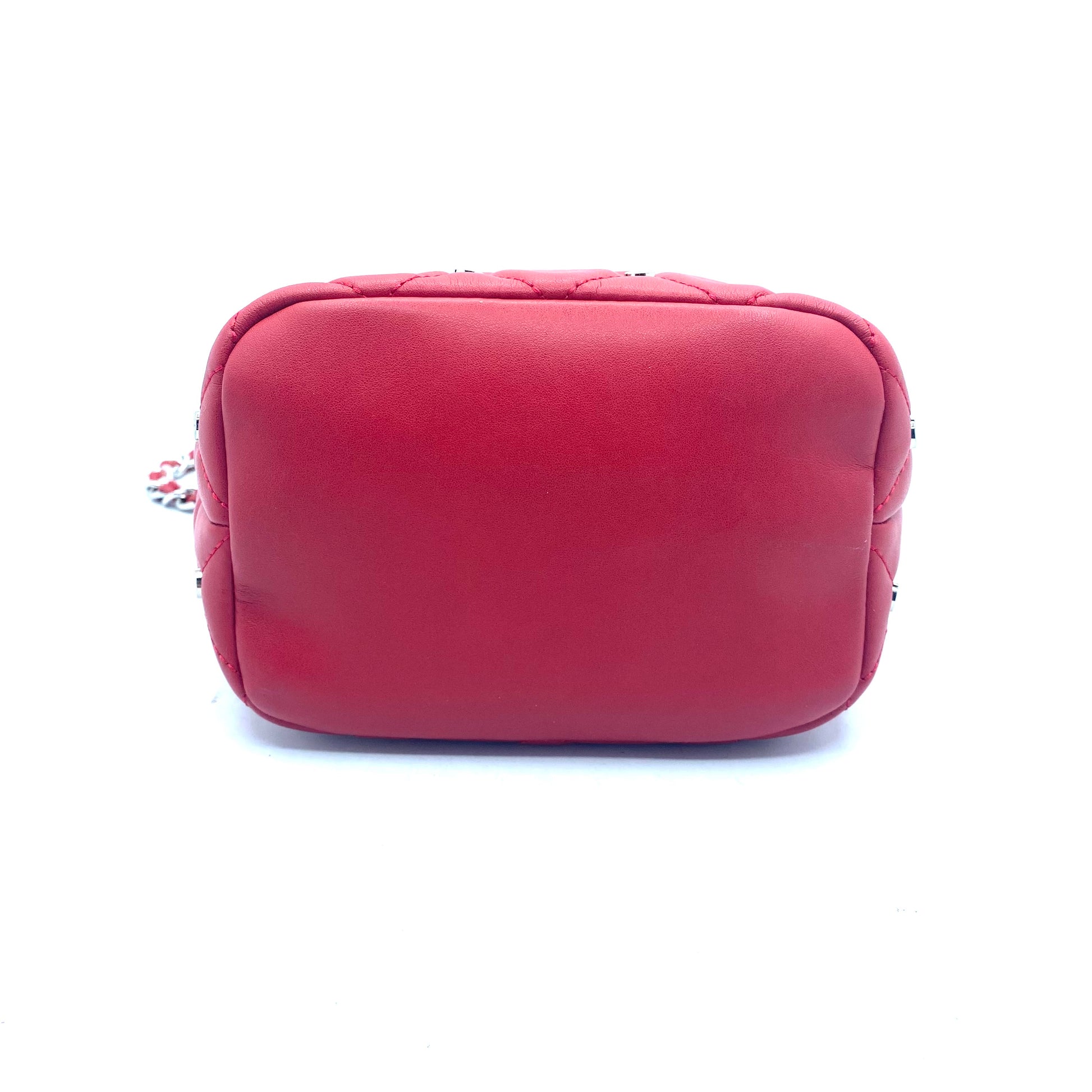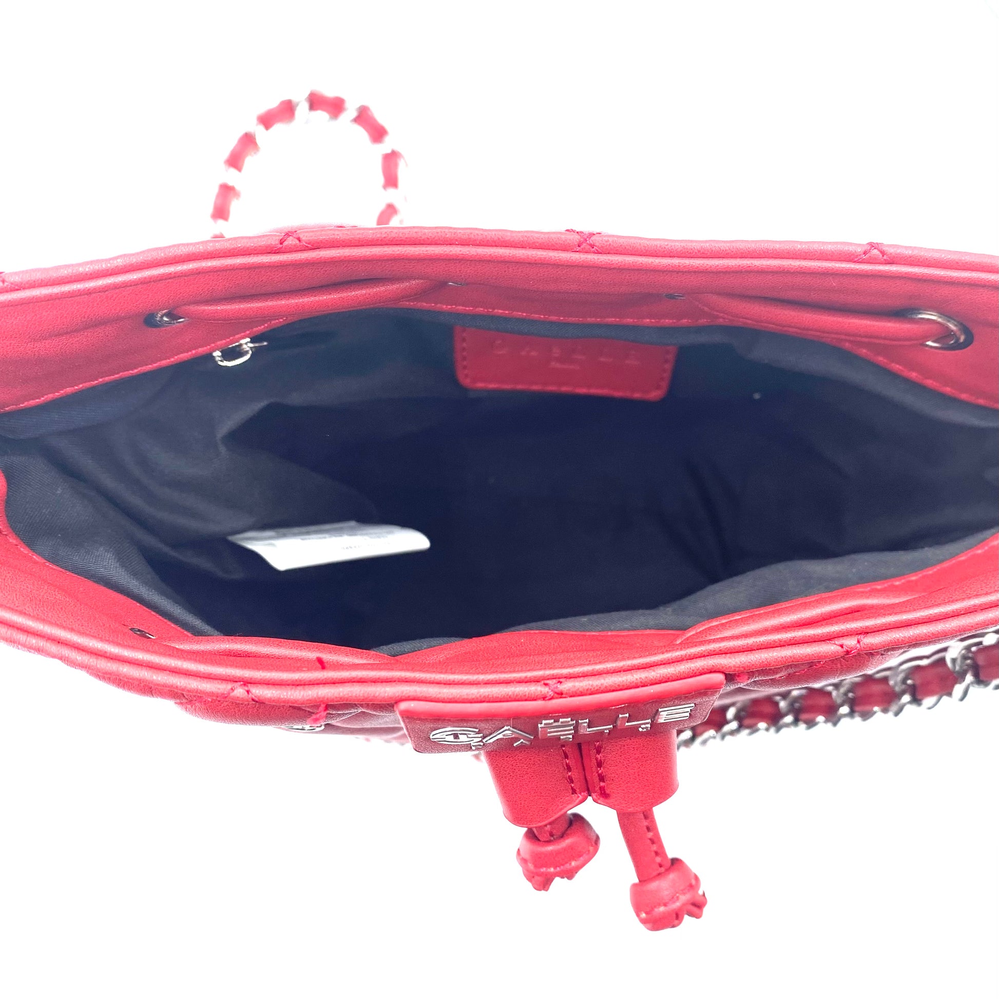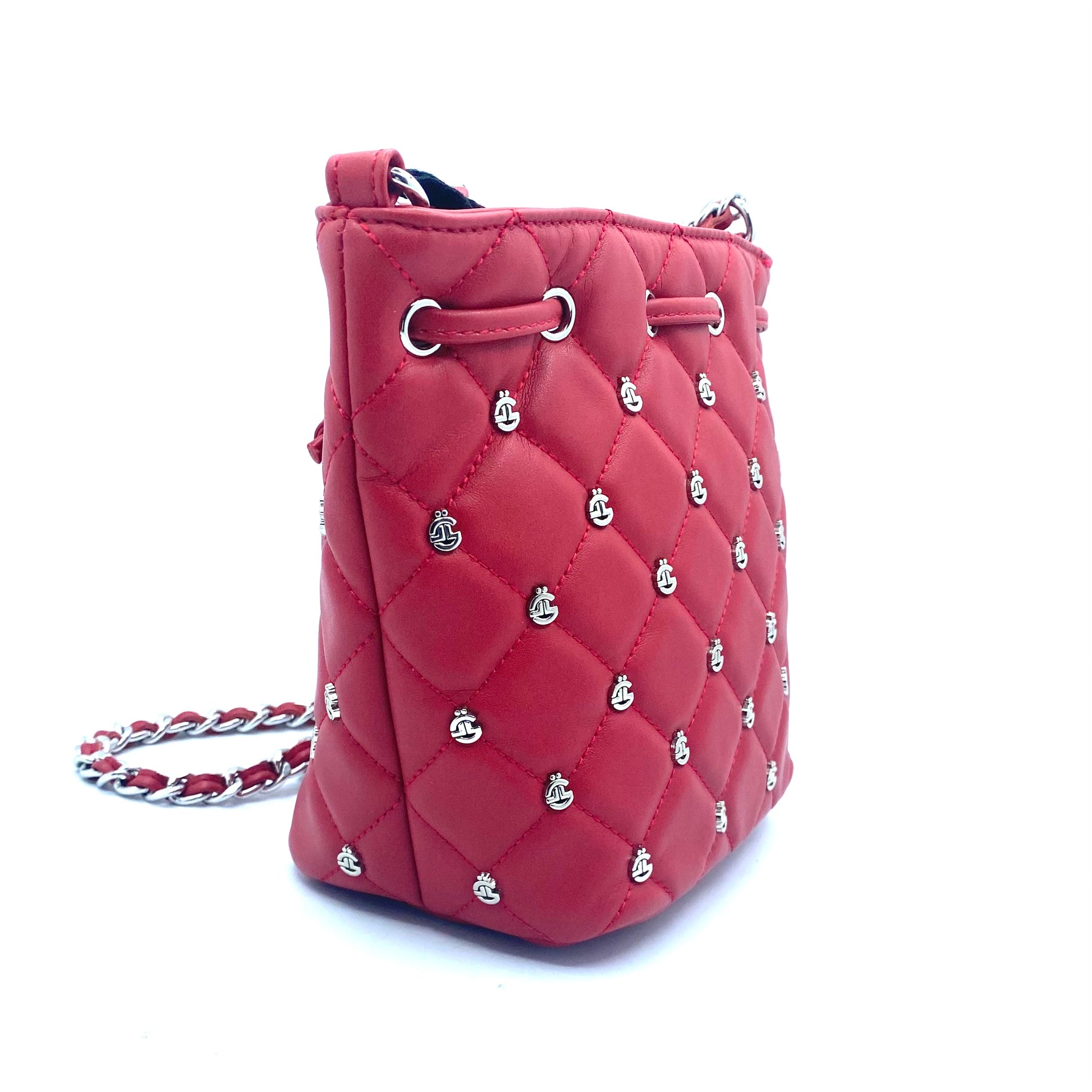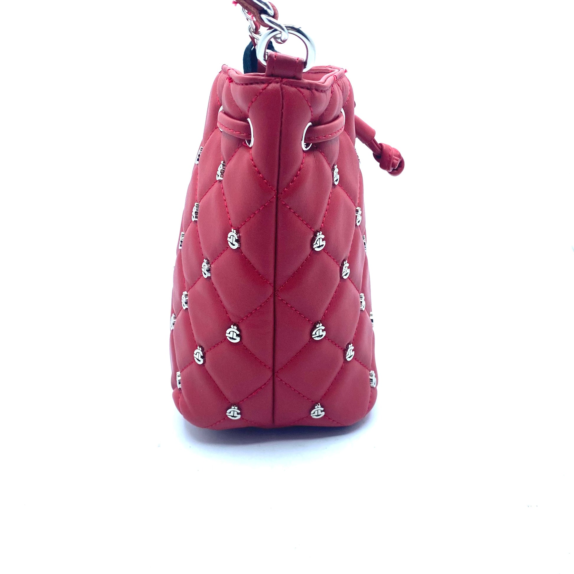 Secchiello in ecopelle con borchie lettere in metallo Gaëlle, raffinata, elegante e compatta tracollina in similpelle trapuntata, con piccole borchie applicate, tracolla con spezzoni in catena dorata e chiusura con coulisse. L'interno è spazioso, foderato e completo di tasca con zip.