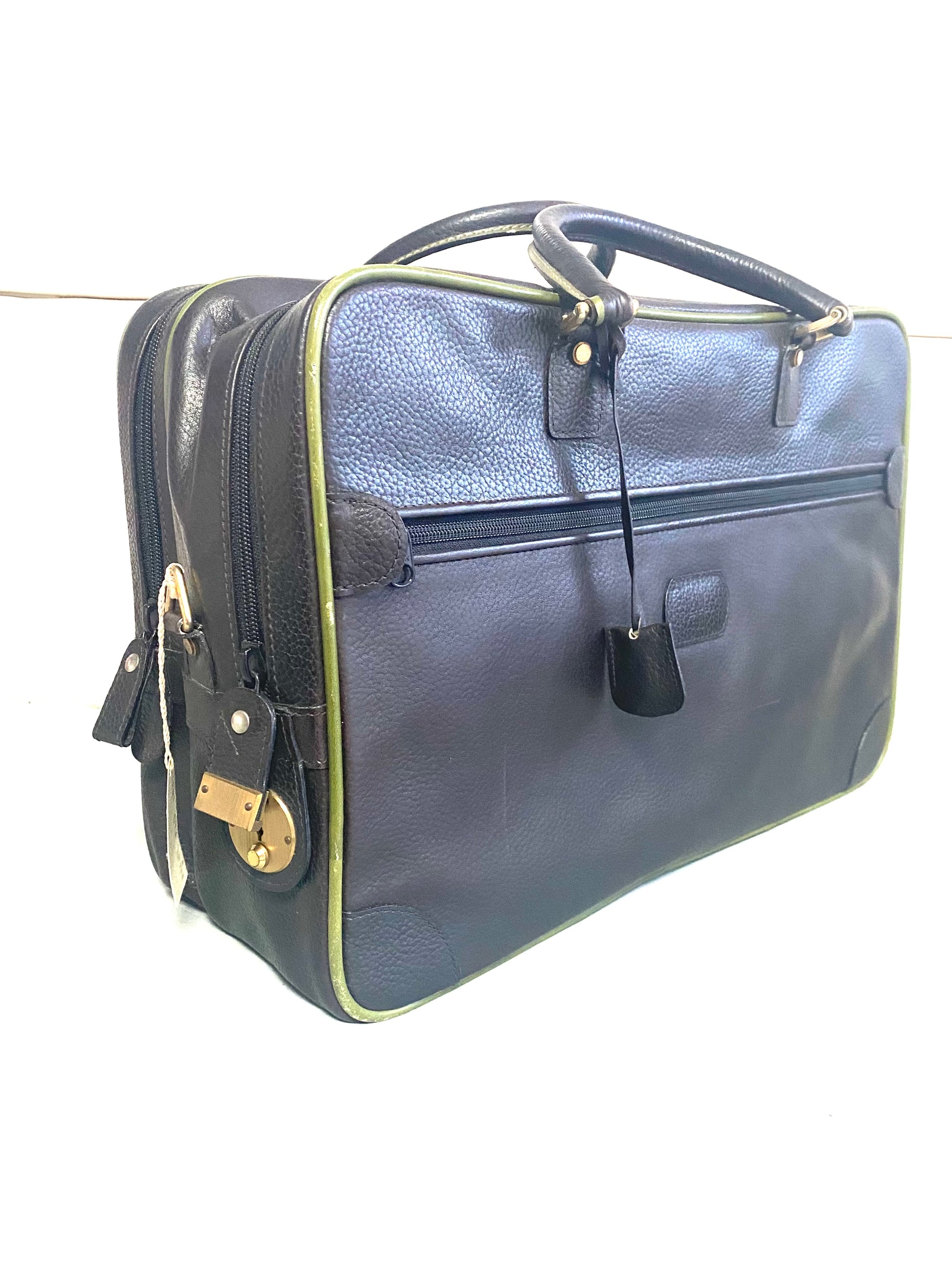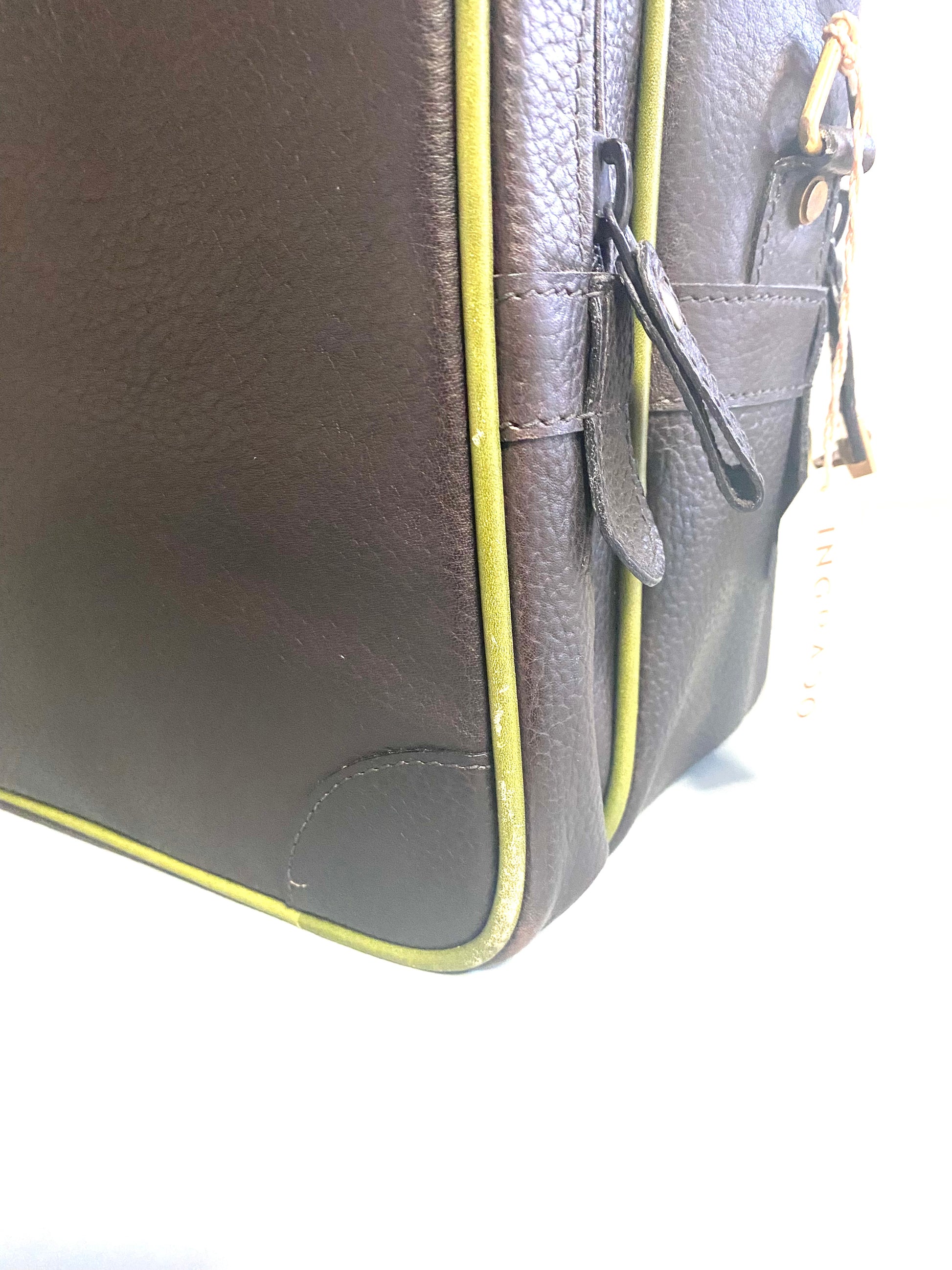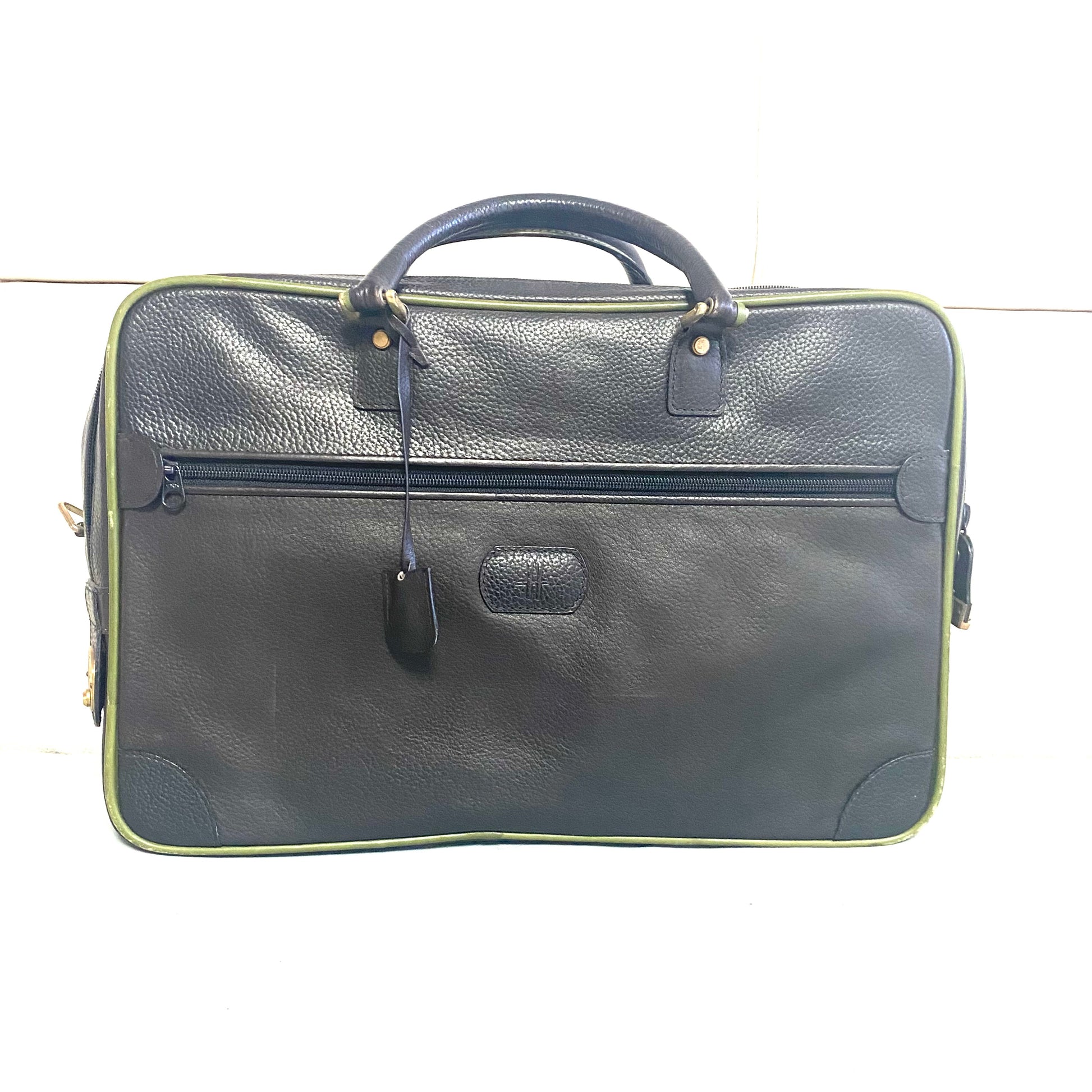 Borsone da viaggio marca Harrods cucito a mano in vera pelle di colore marrone con bordi verdi