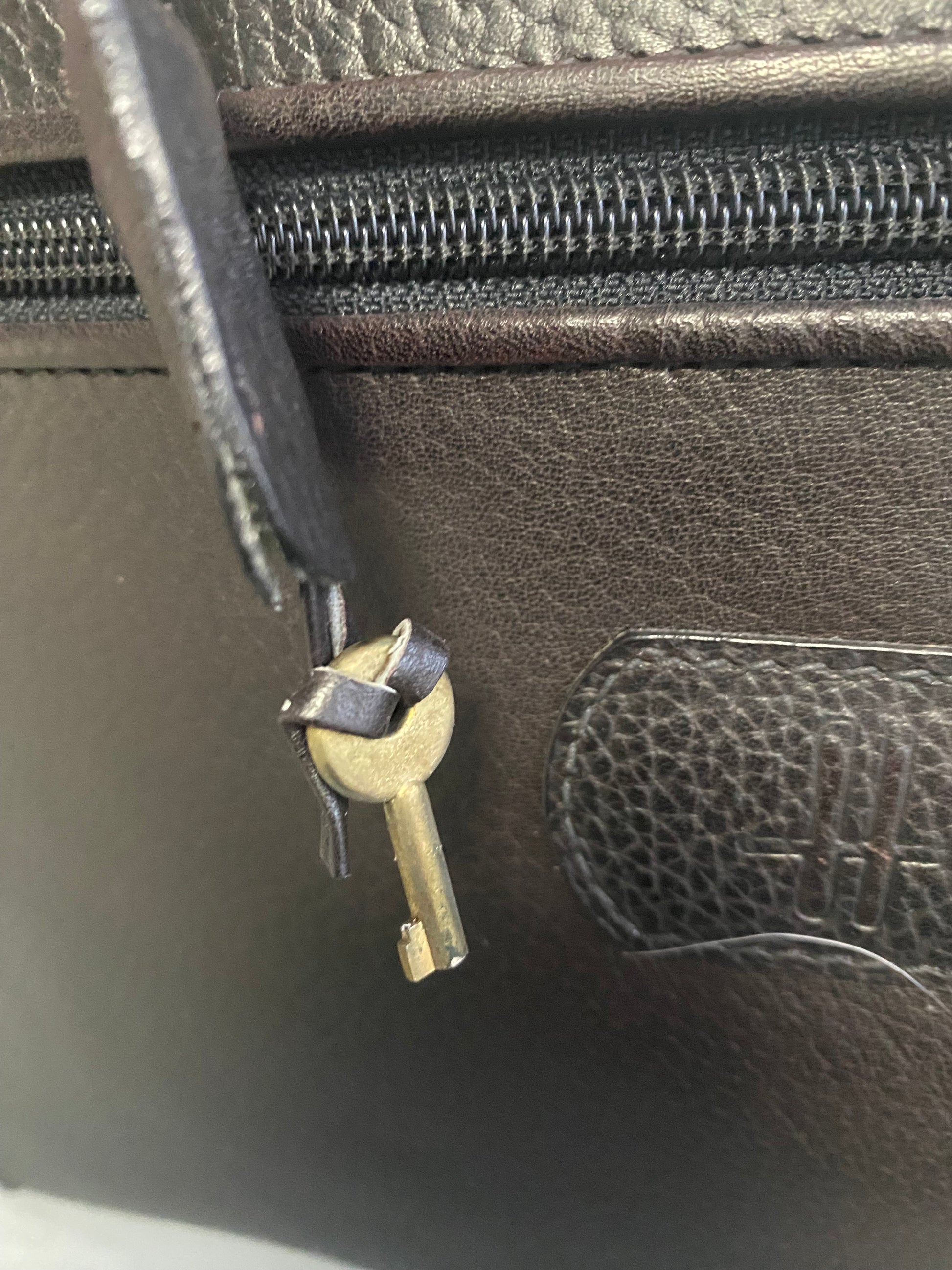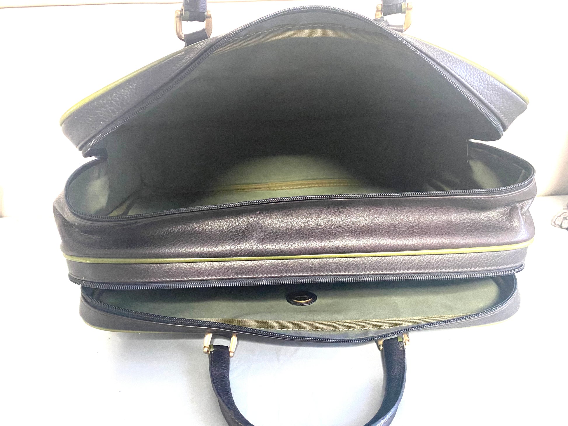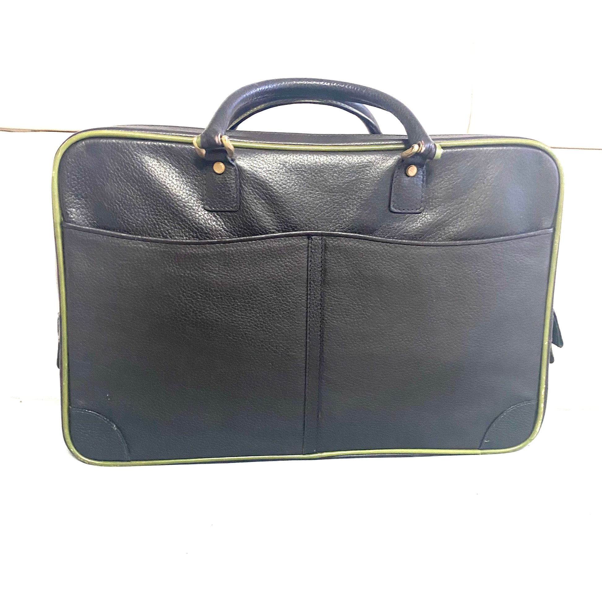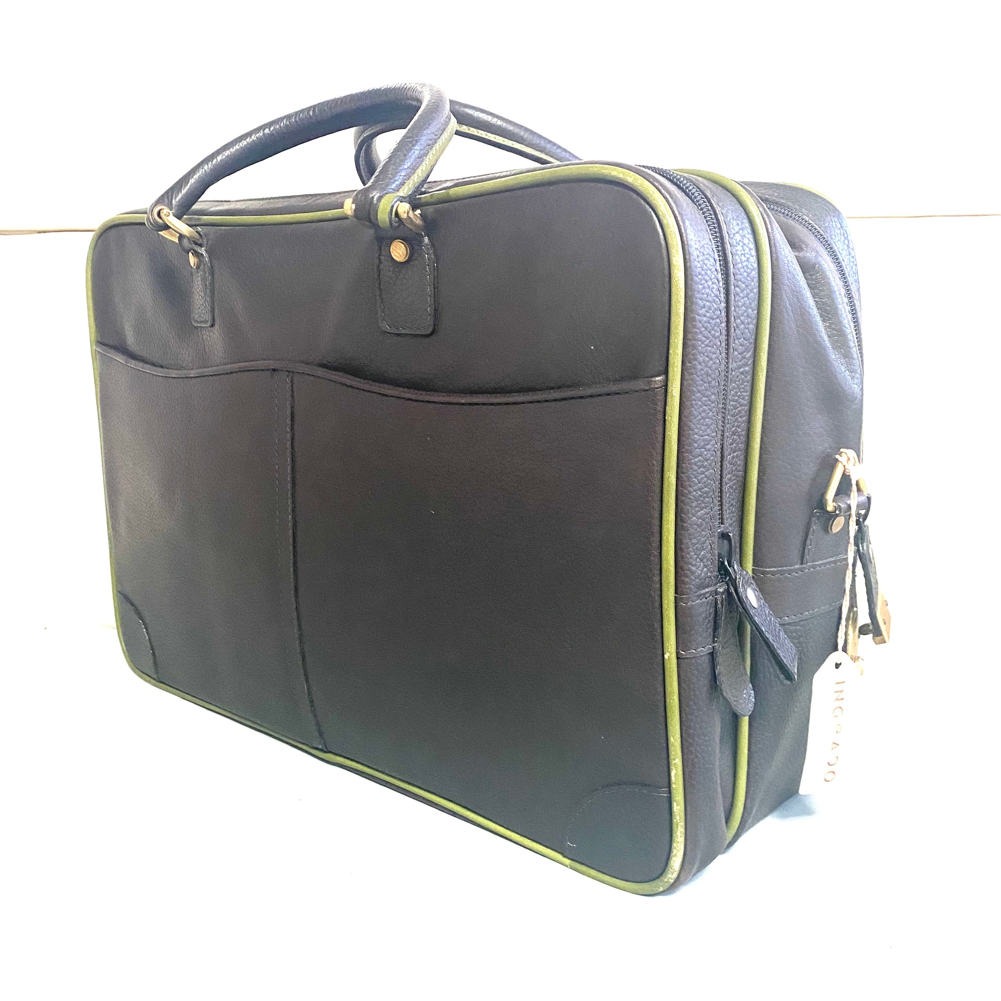Borsone da viaggio marca Harrods cucito a mano in vera pelle di colore marrone con bordi verdi