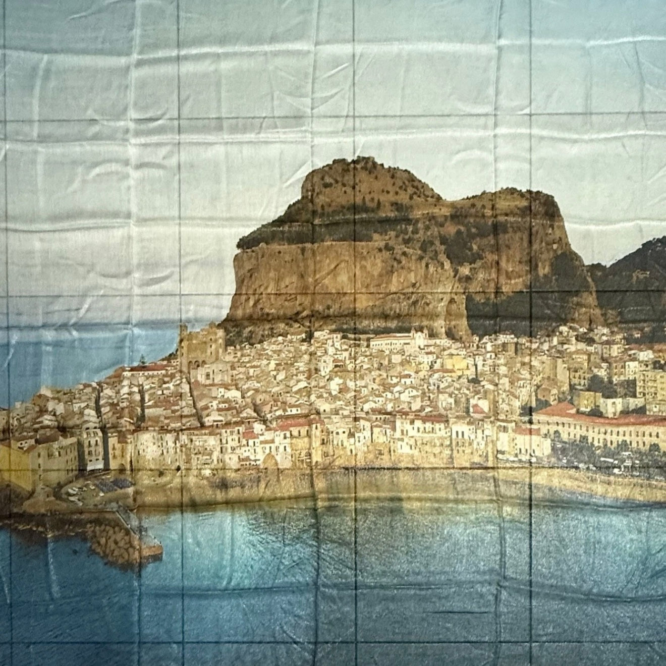 Sciarpa Laura Breda Haute Couture con stampata un'immagine panoramica di Cefalù, in Sicilia.