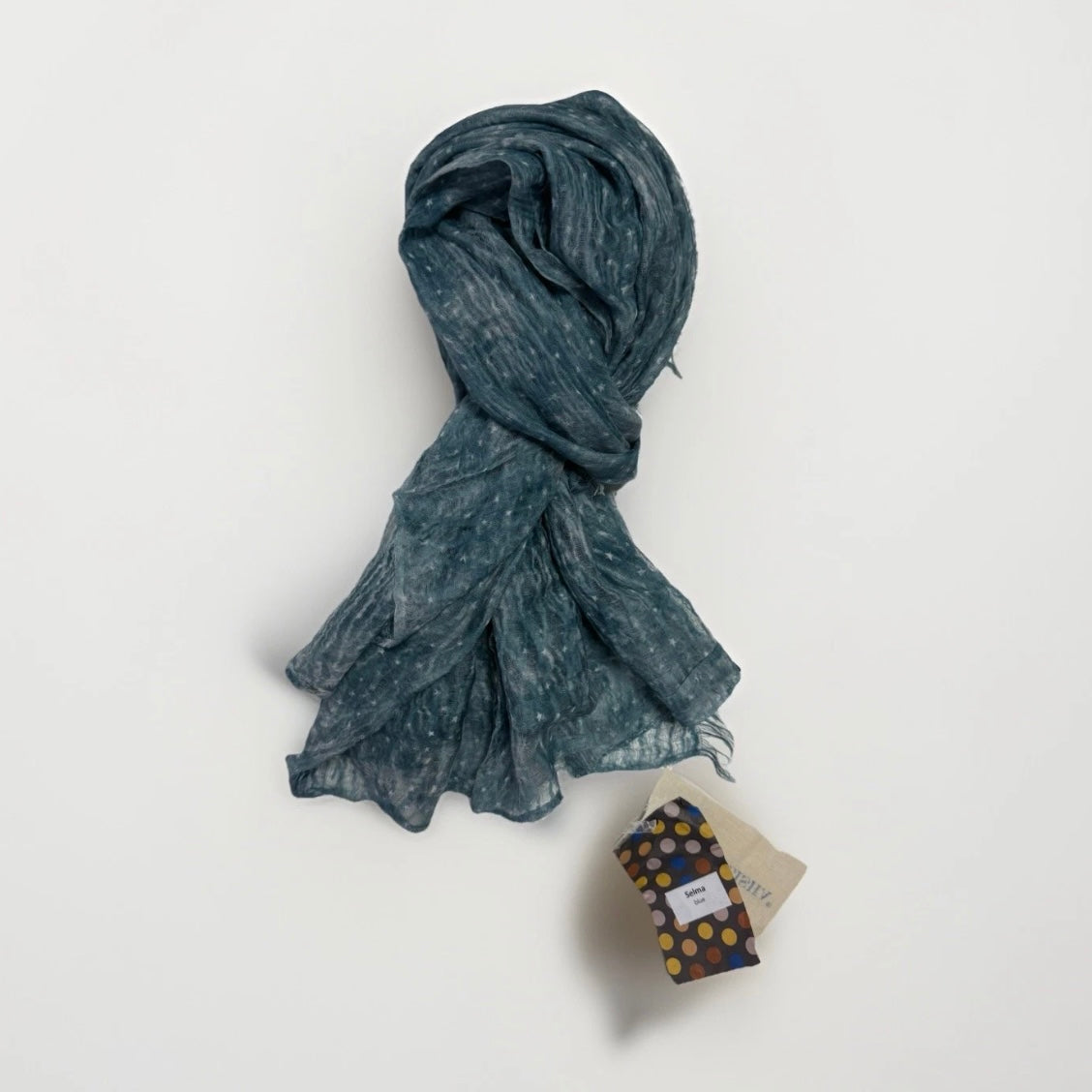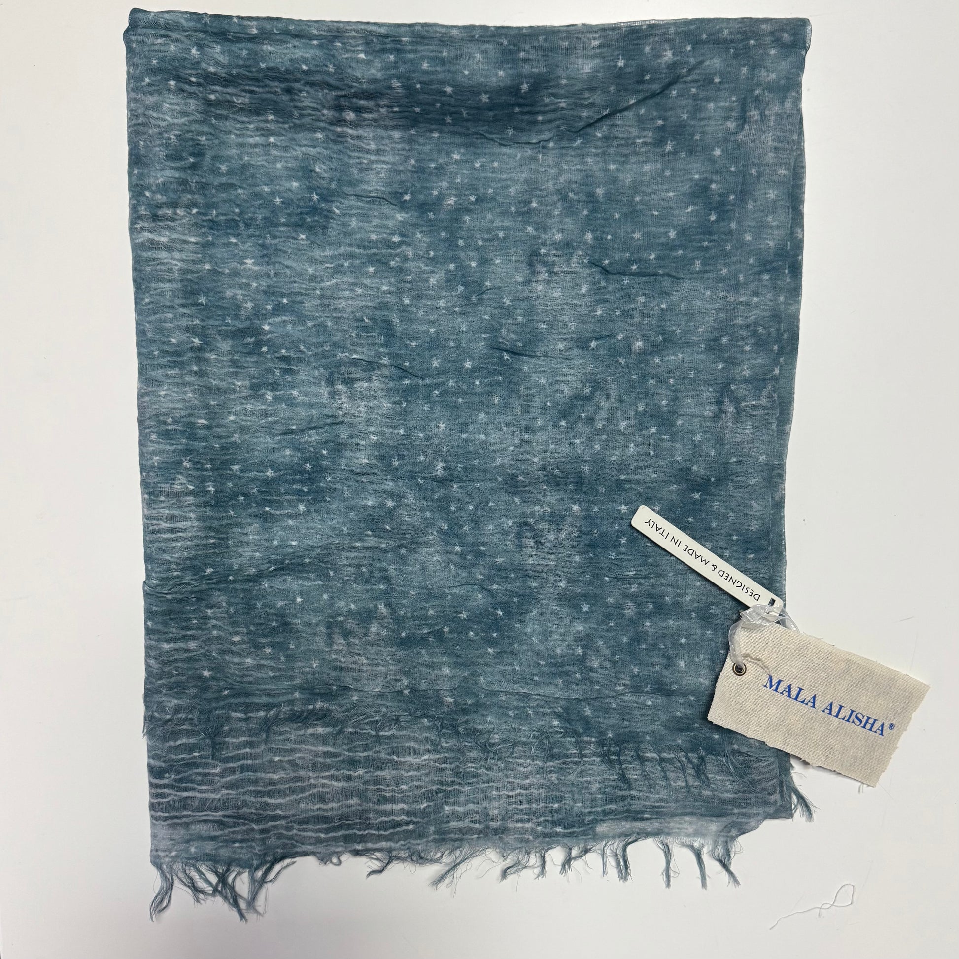 Sciarpa Mala Alisha modello Selma Blue 100% cotone colore blu con fantasia stelline, da una sensazione leggera e morbida, I bordi della sciarpa sono decorati con delicate frange per un sottile tocco di charme.