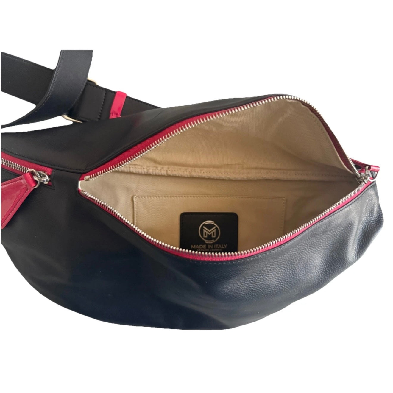 La tracolla è regolabile, le zip sono oversize e resistenti con dettagli lucidi a contrasto per valorizzare la vera pelle italiana di qualità che abbiamo recuperato col metodo AlterLife® per un lusso sostenibile.