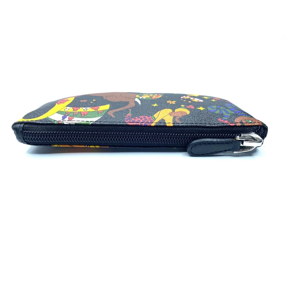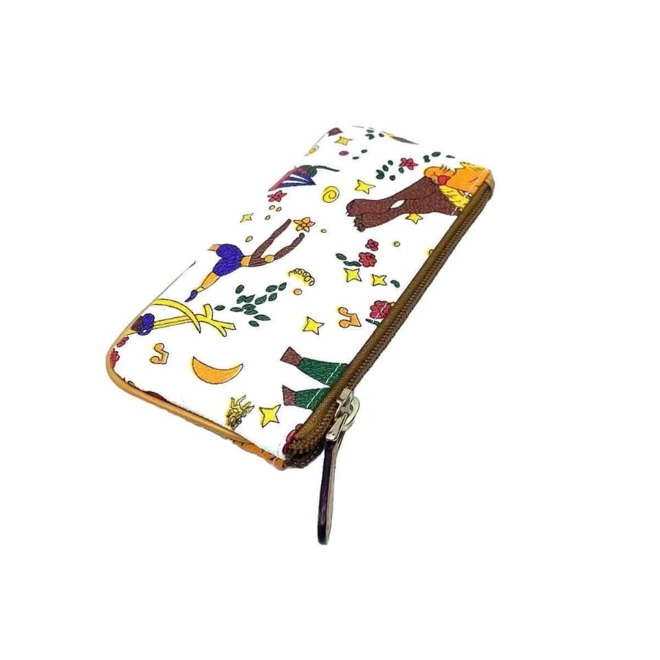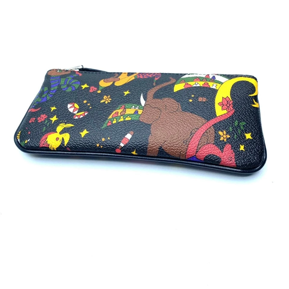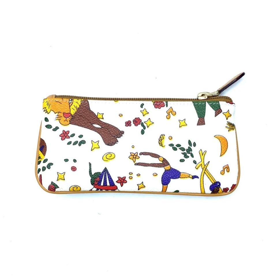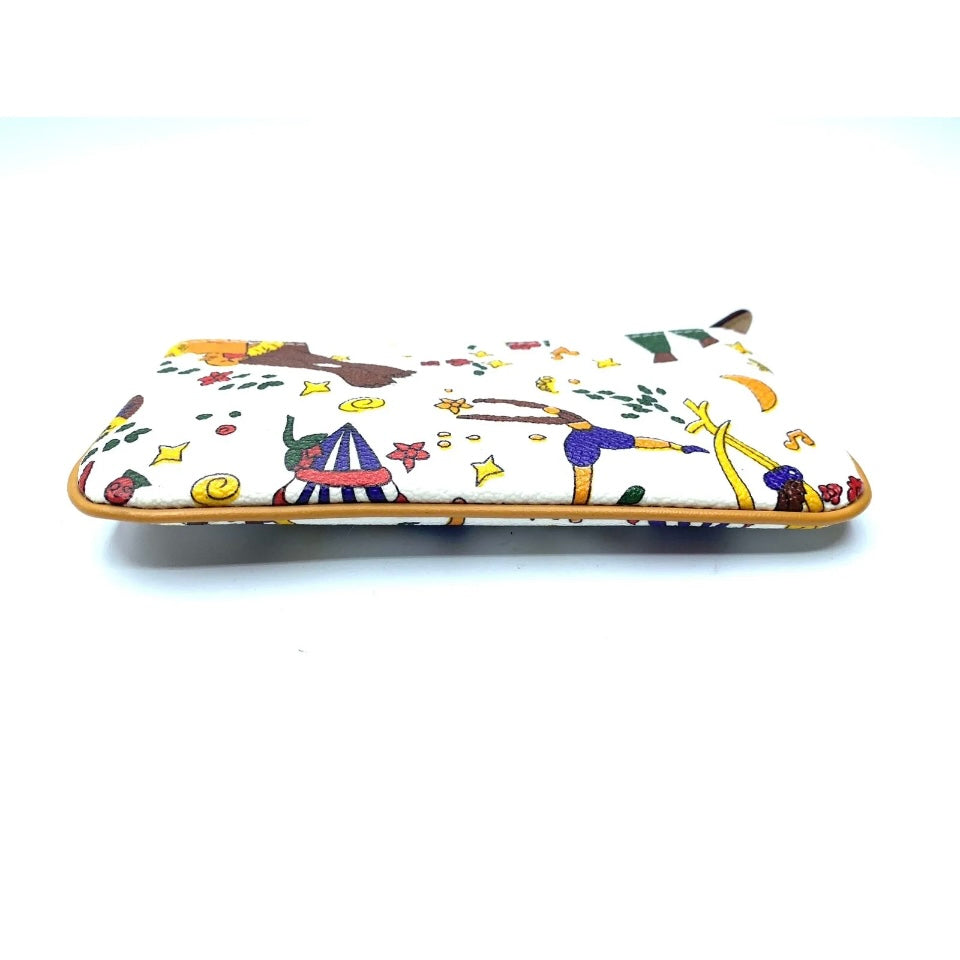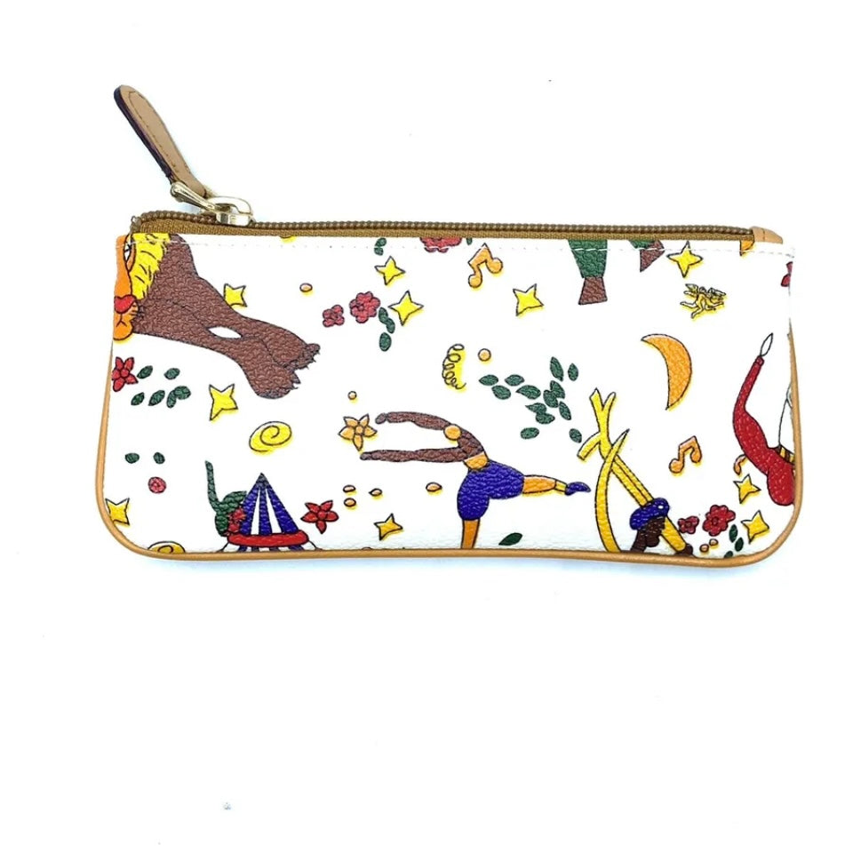 Pochette magic circus realizzata in tessuto goffrato stampato con fantasia magic circus, finiture in metallo, riporti in cuoio, chiusura con zip