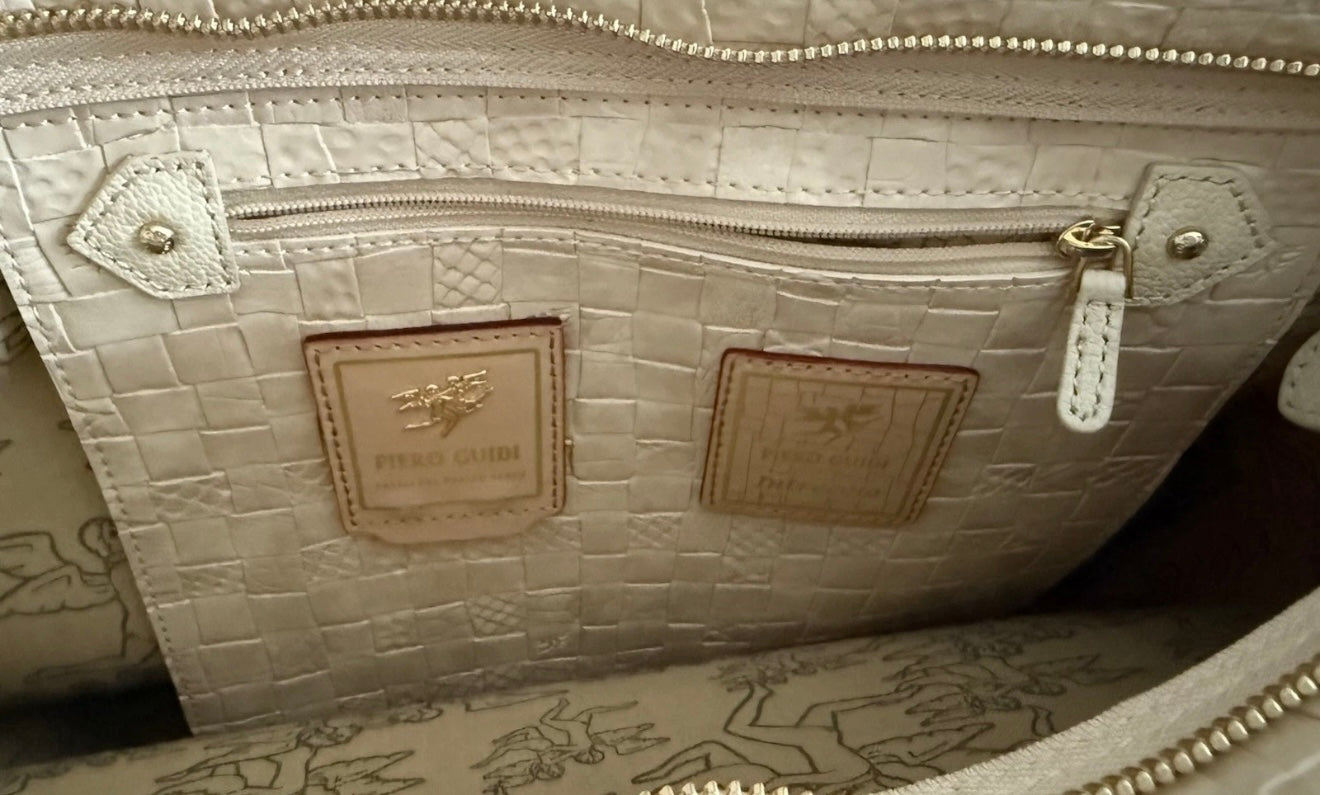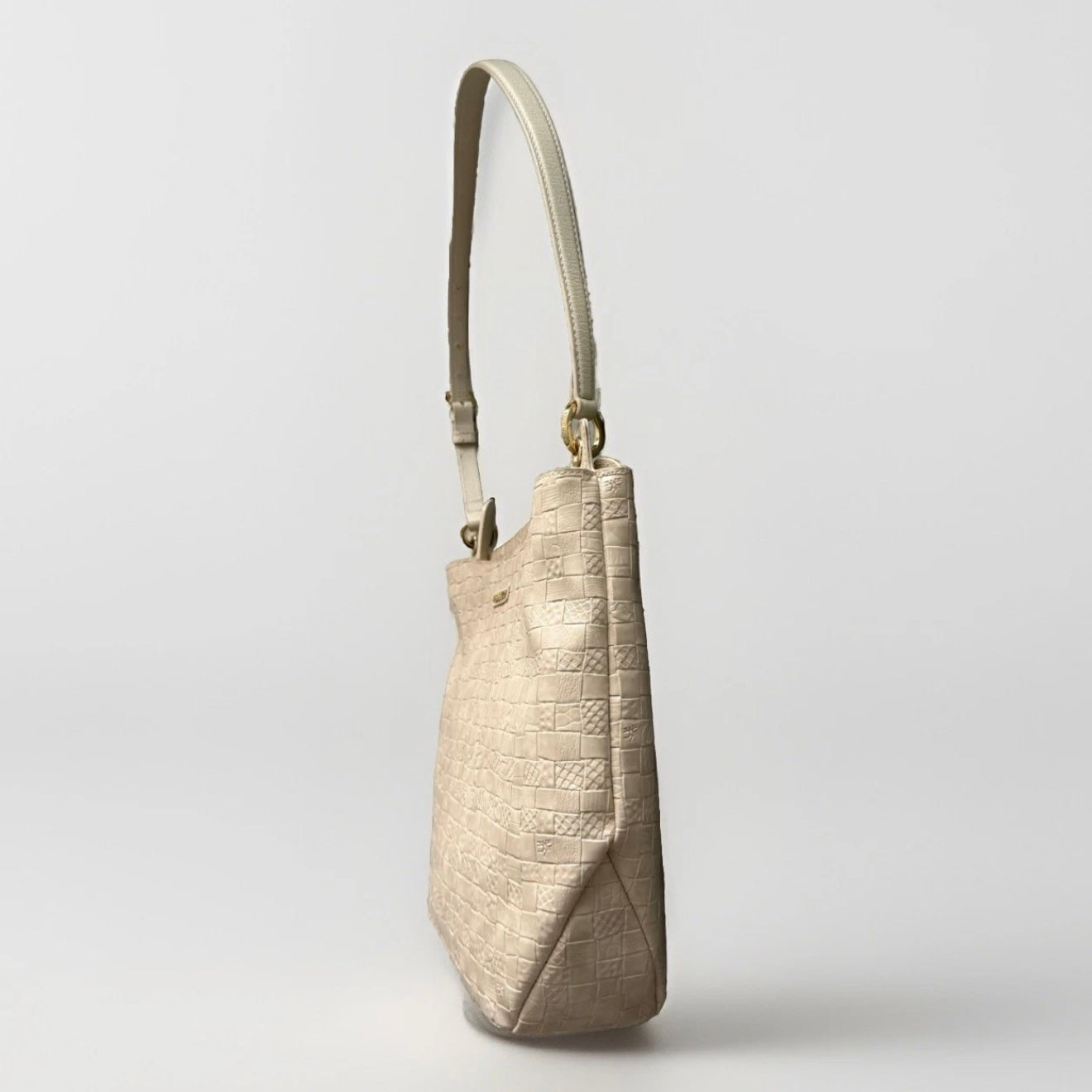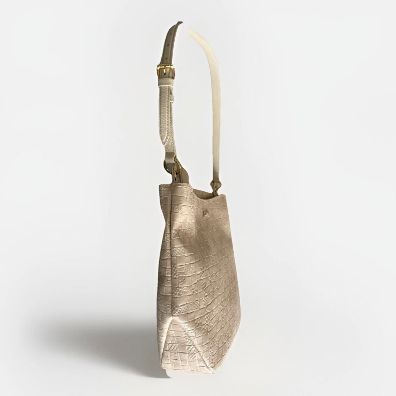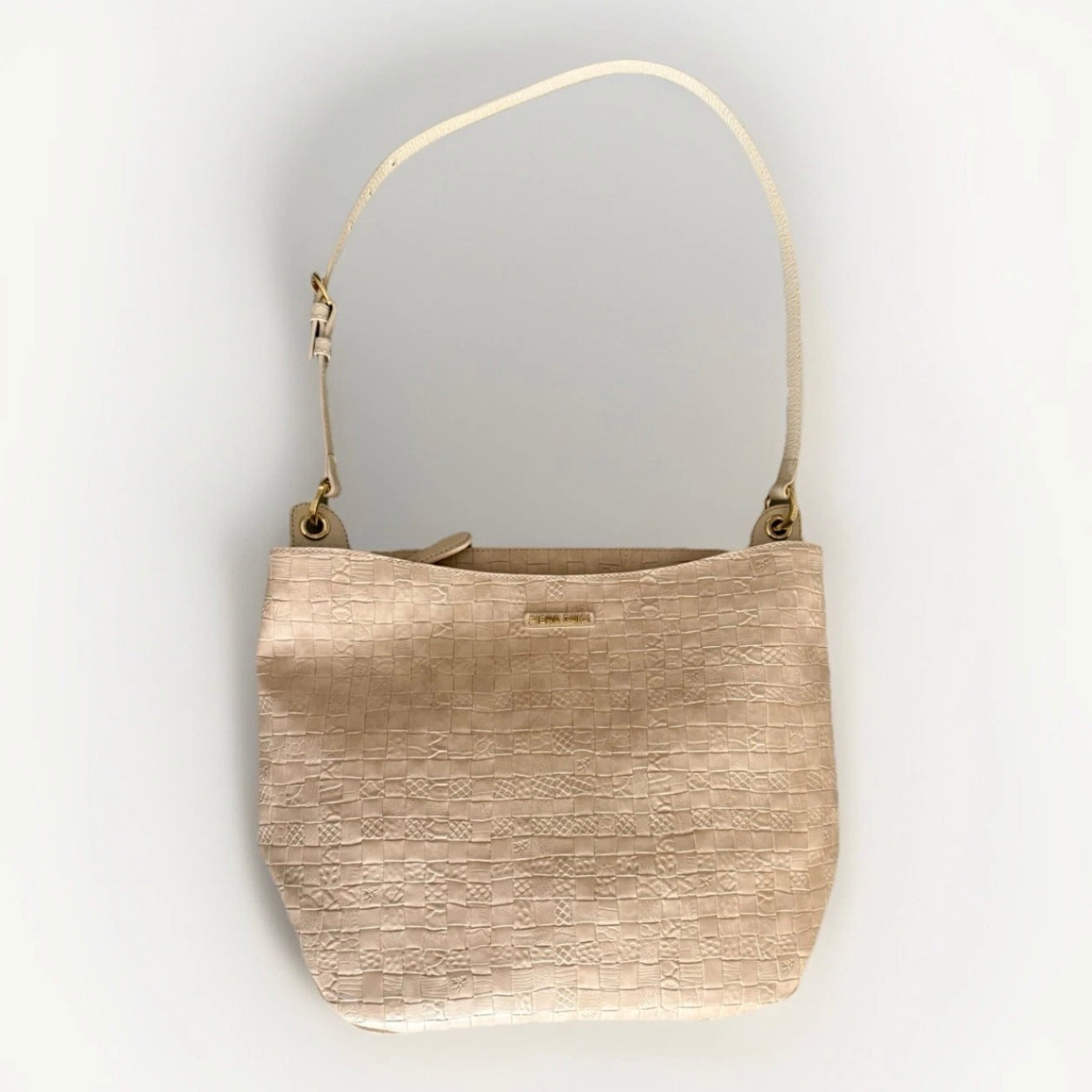 Piero Guidi Borsa a spalla realizzata in tessuto goffrato a rilievo con stampa intreccio, inserti in pelle.