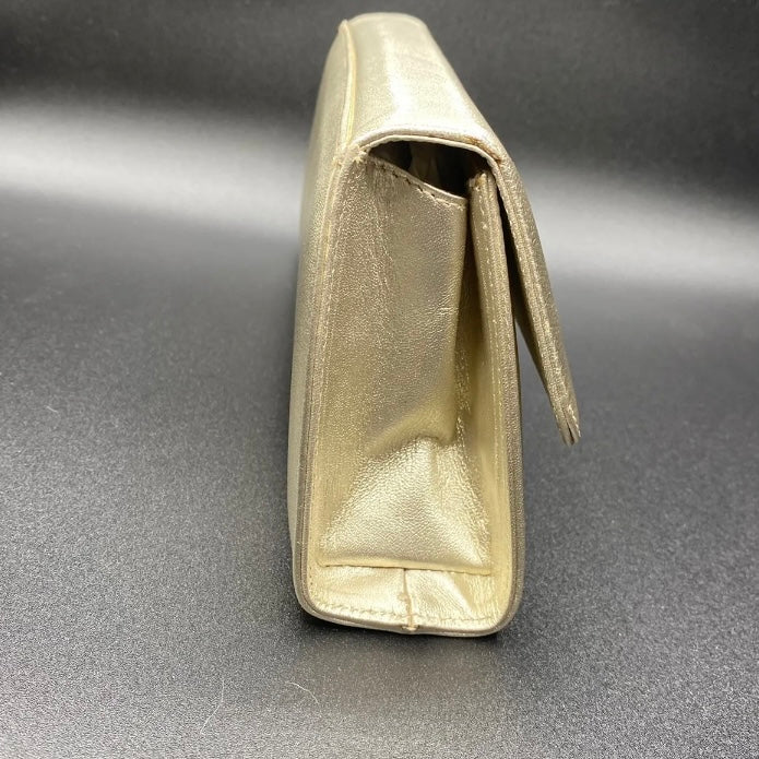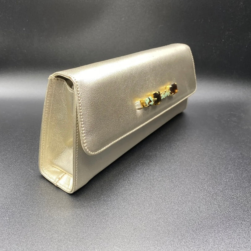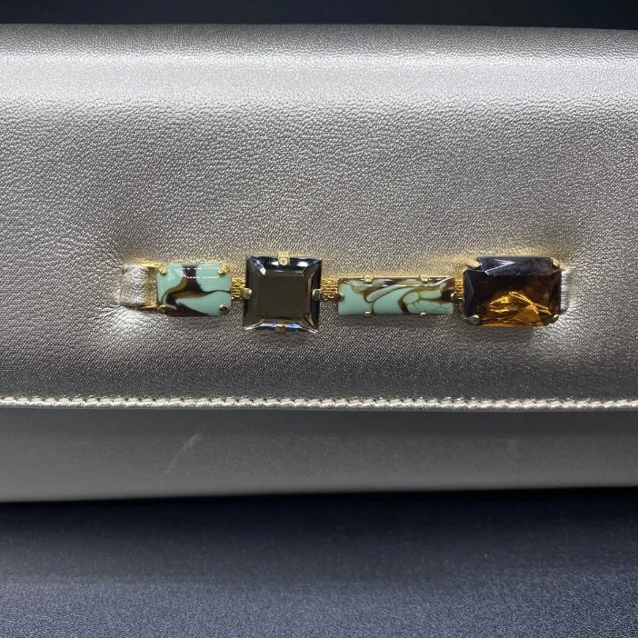 Pochette in pelle chiusa con bottone magnetico marca Martin Clay color beige con bottoni gioiello da portare a o mano.