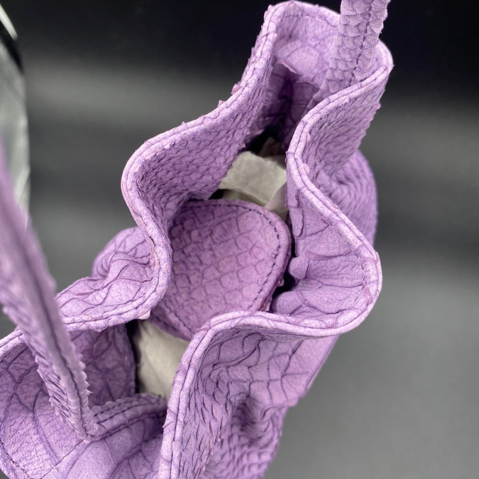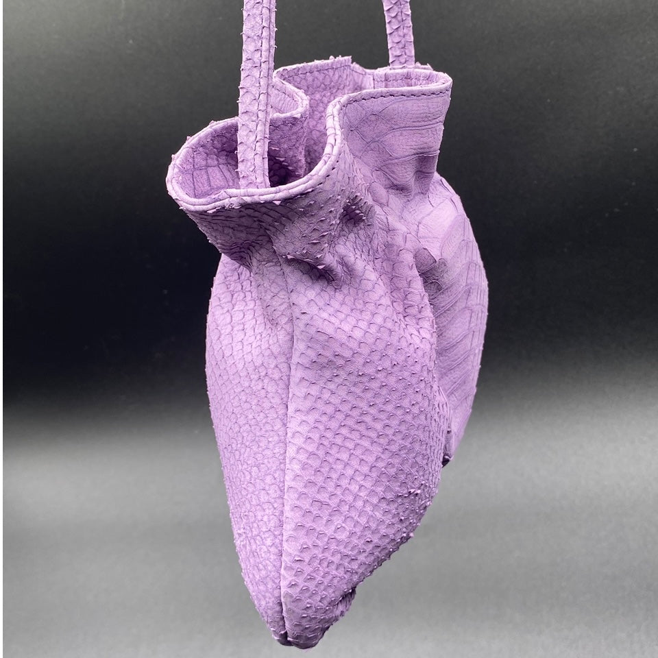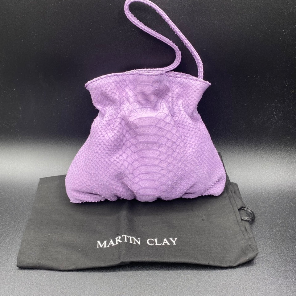 Pochette in vera pelle scamosciata morbida chiusa con bottone magnetico marca Martin Clay color ciclamino fantasia pitone da portare a mano