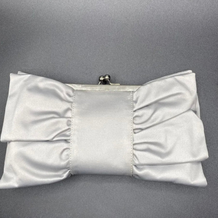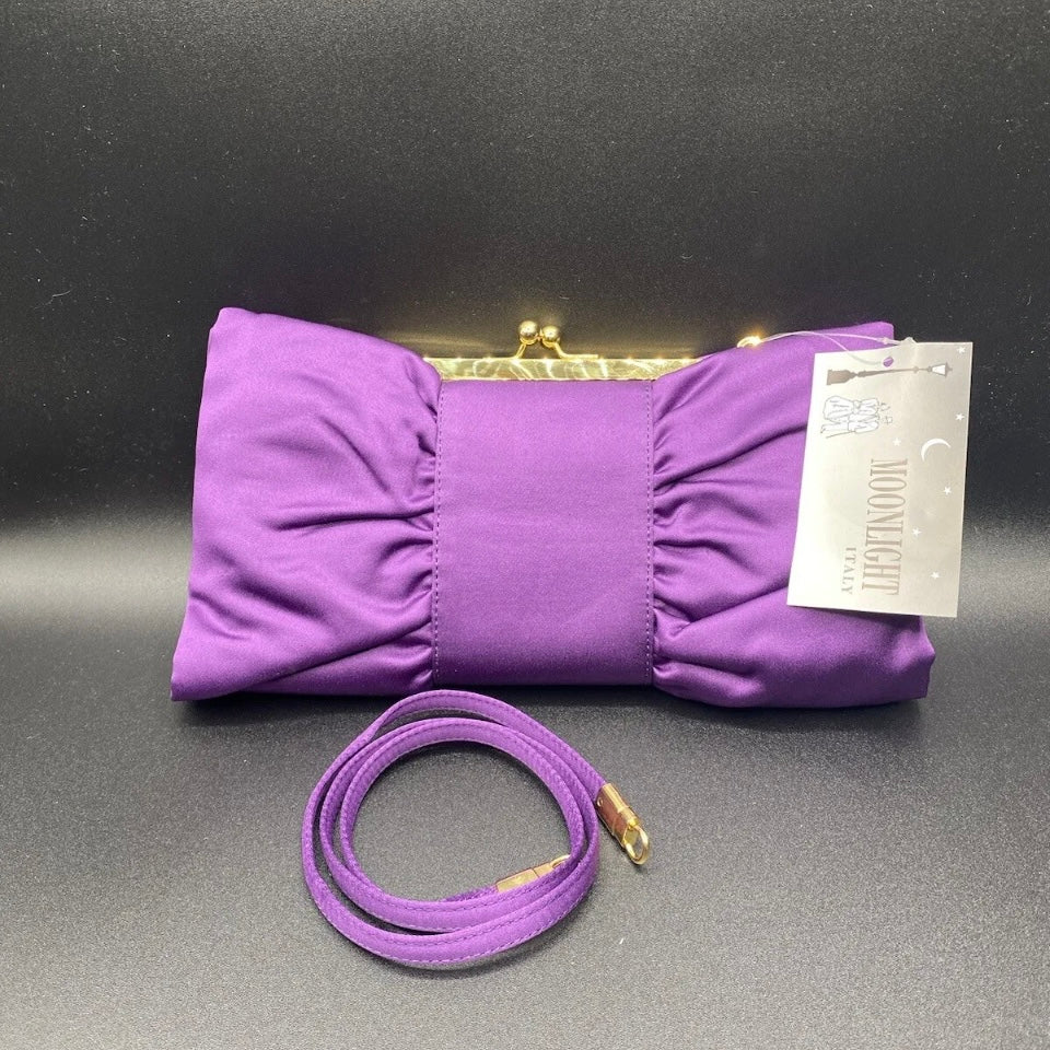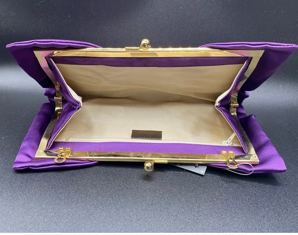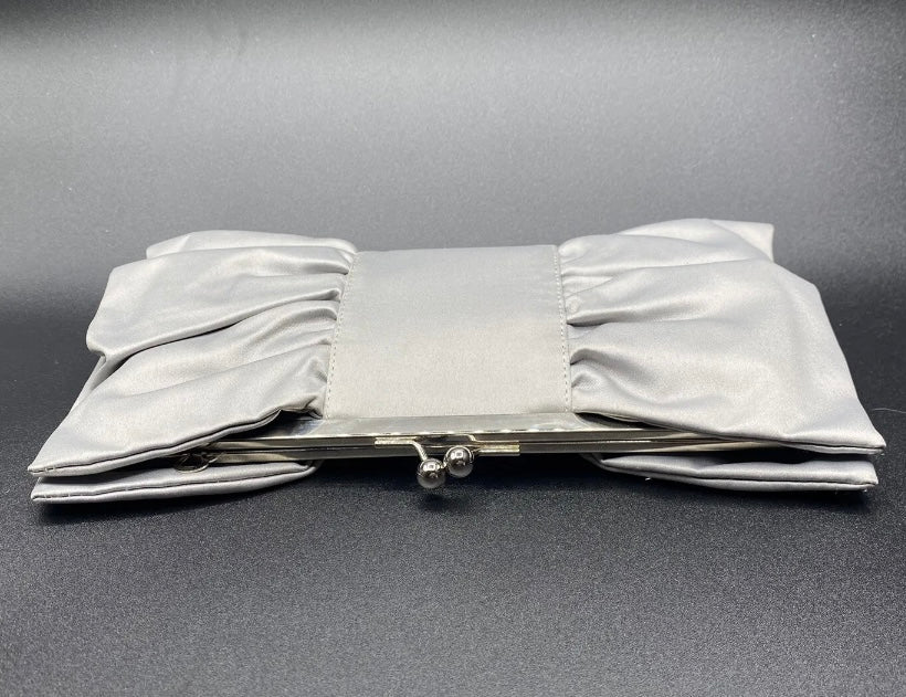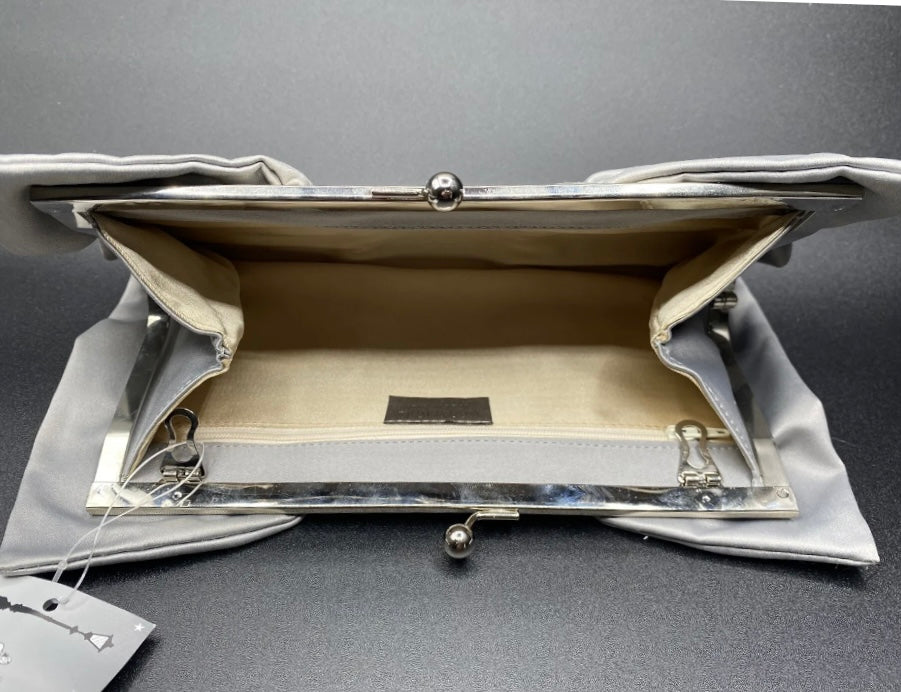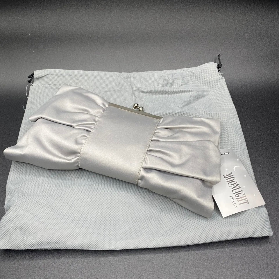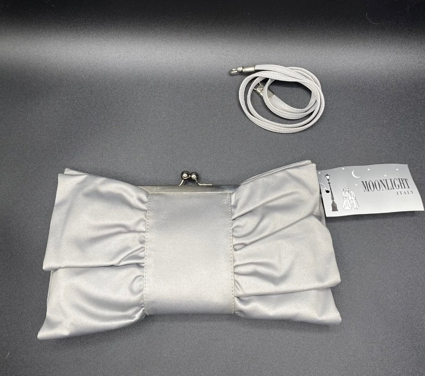 Bellissima ed elegante Pochette chiusa a scatto con marca Moonlight color grigio o viola con fantasia fiocco, da indossare a tracolla o a mano