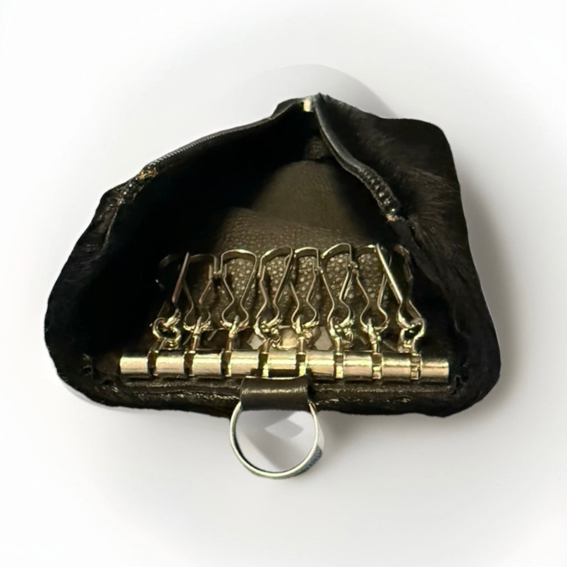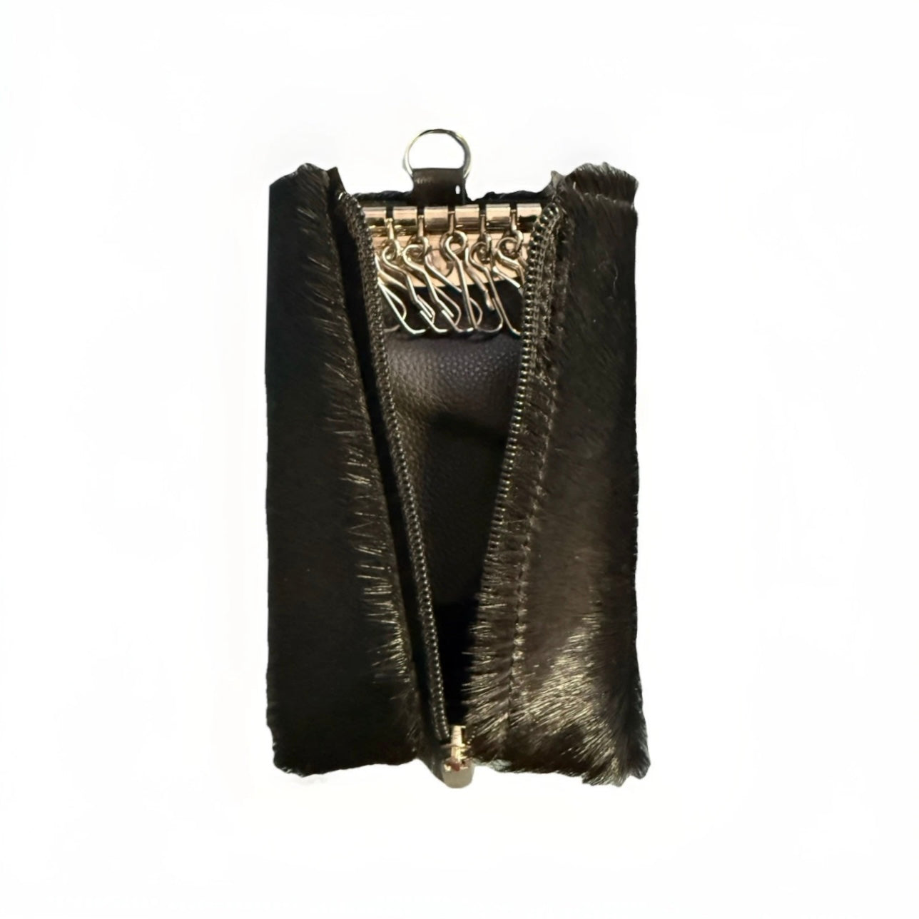 Portachiavi donna artigianale realizzato a mano in pelo sintetico di colore nero, interno ha 8 ganci per chiavi