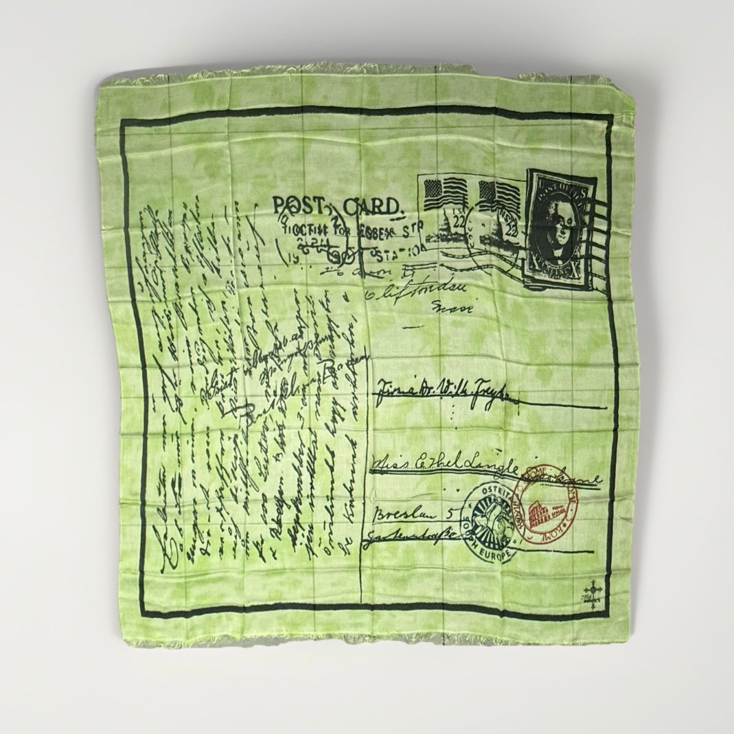 Sciarpa rettangolare Rocks Italy Sciarpa Rocks Italy con un design ispirato a una cartolina vintage. Presenta una stampa dettagliata su sfondo verde chiaro, con scritte nere e timbri postali.