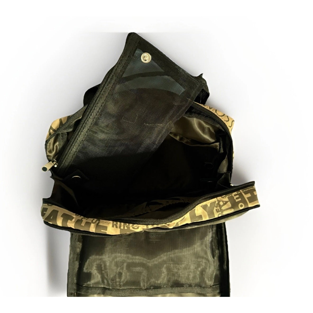 -Uno scomparto con apertura a soffietto ha varie tasche e una bustina a rete attaccata con bottoni a pressione staccabile chiusa con cerniera