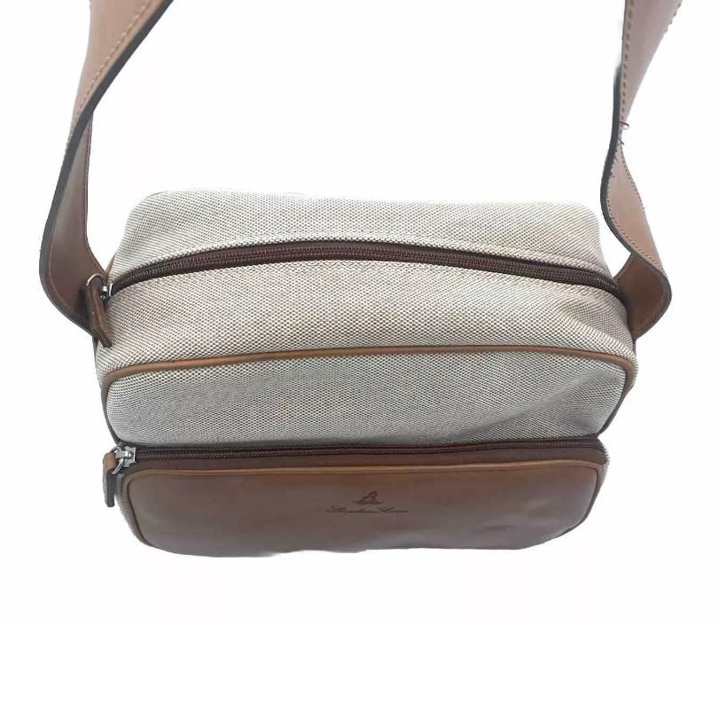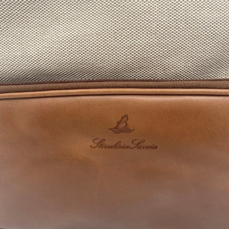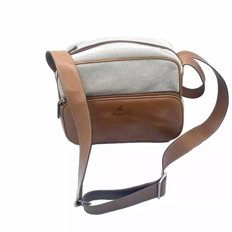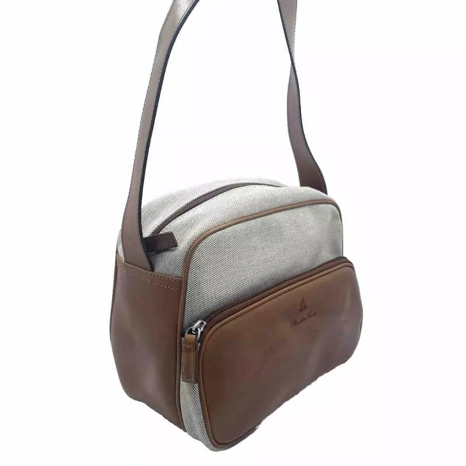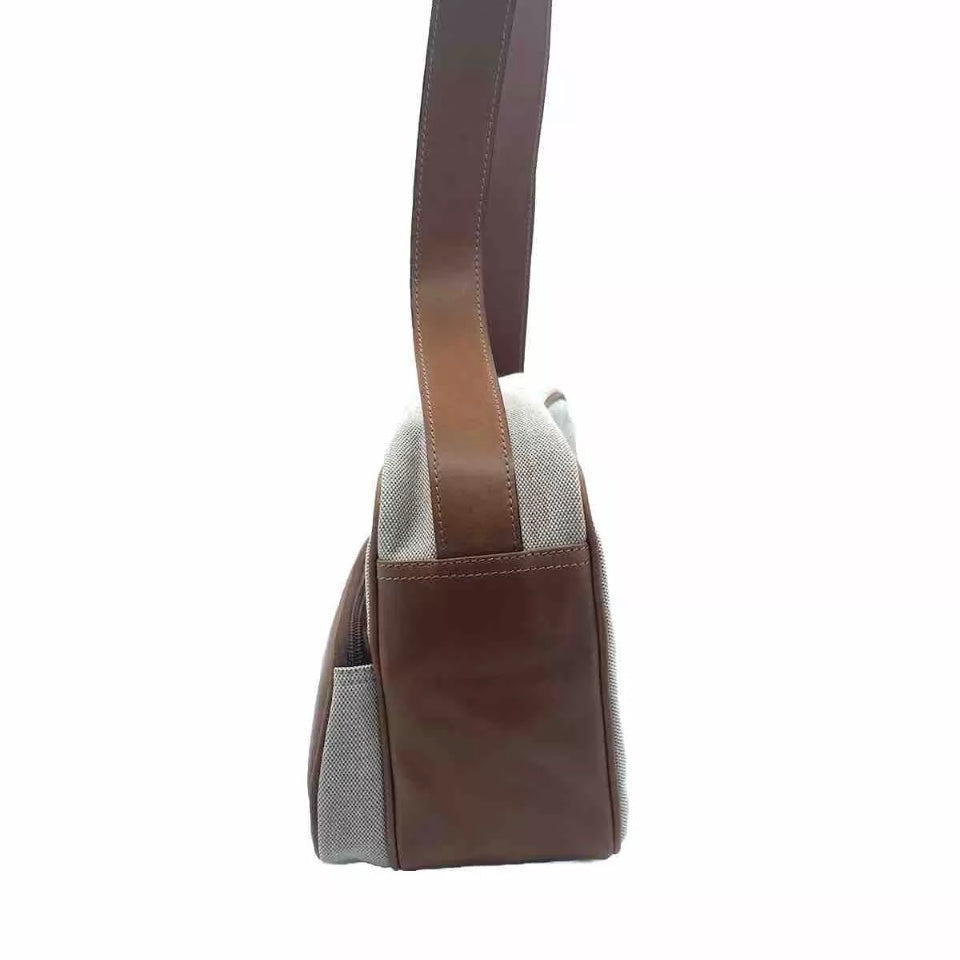 Shopping bag Stivaleria Savoia Milano borsa da portare a spalla, tracolla regolabile in vera pelle vacchetta di colore marrone chiaro e tessuto beige realizzata dall'azienda Dell'Ga che è consederata un must have nel mercato della pelletteria di alta gamma. realizzata da abili pellettieri mediante l'utilizzo di un pellame bovino conciato con tannini vegetali e successivamente tamponato a mano