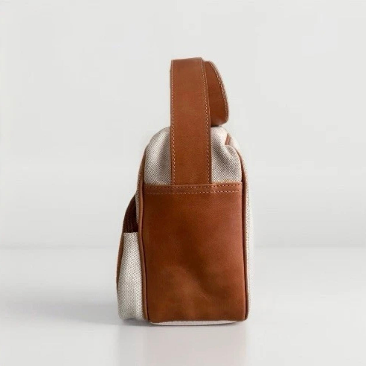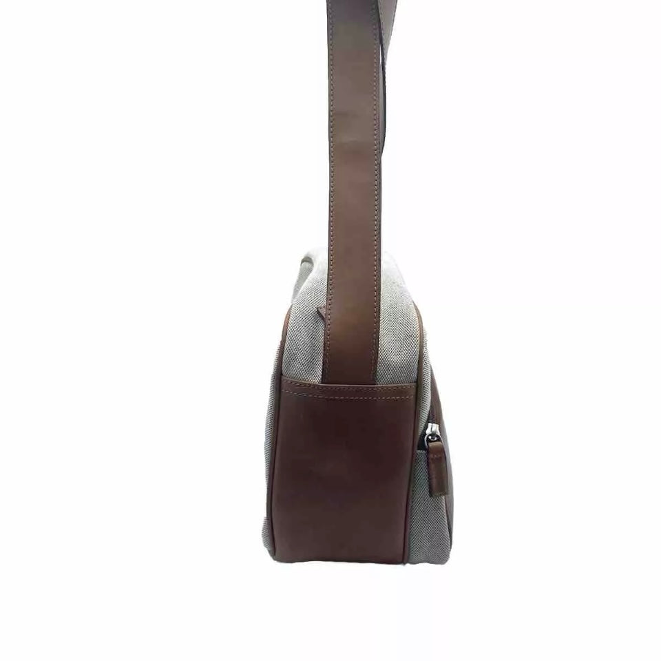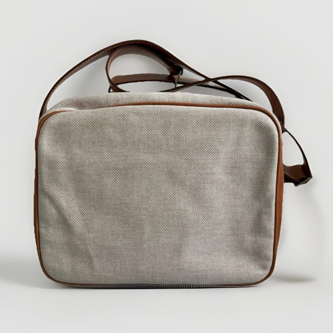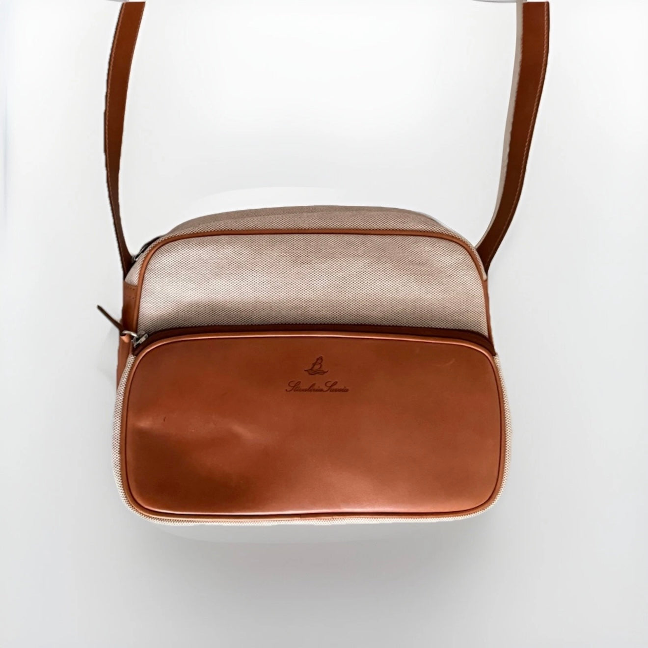 Shopping bag Stivaleria Savoia Milano borsa da portare a spalla, tracolla regolabile in vera pelle vacchetta di colore marrone chiaro e tessuto beige realizzata dall'azienda Dell'Ga che è consederata un must have nel mercato della pelletteria di alta gamma. realizzata da abili pellettieri mediante l'utilizzo di un pellame bovino conciato con tannini vegetali e successivamente tamponato a mano