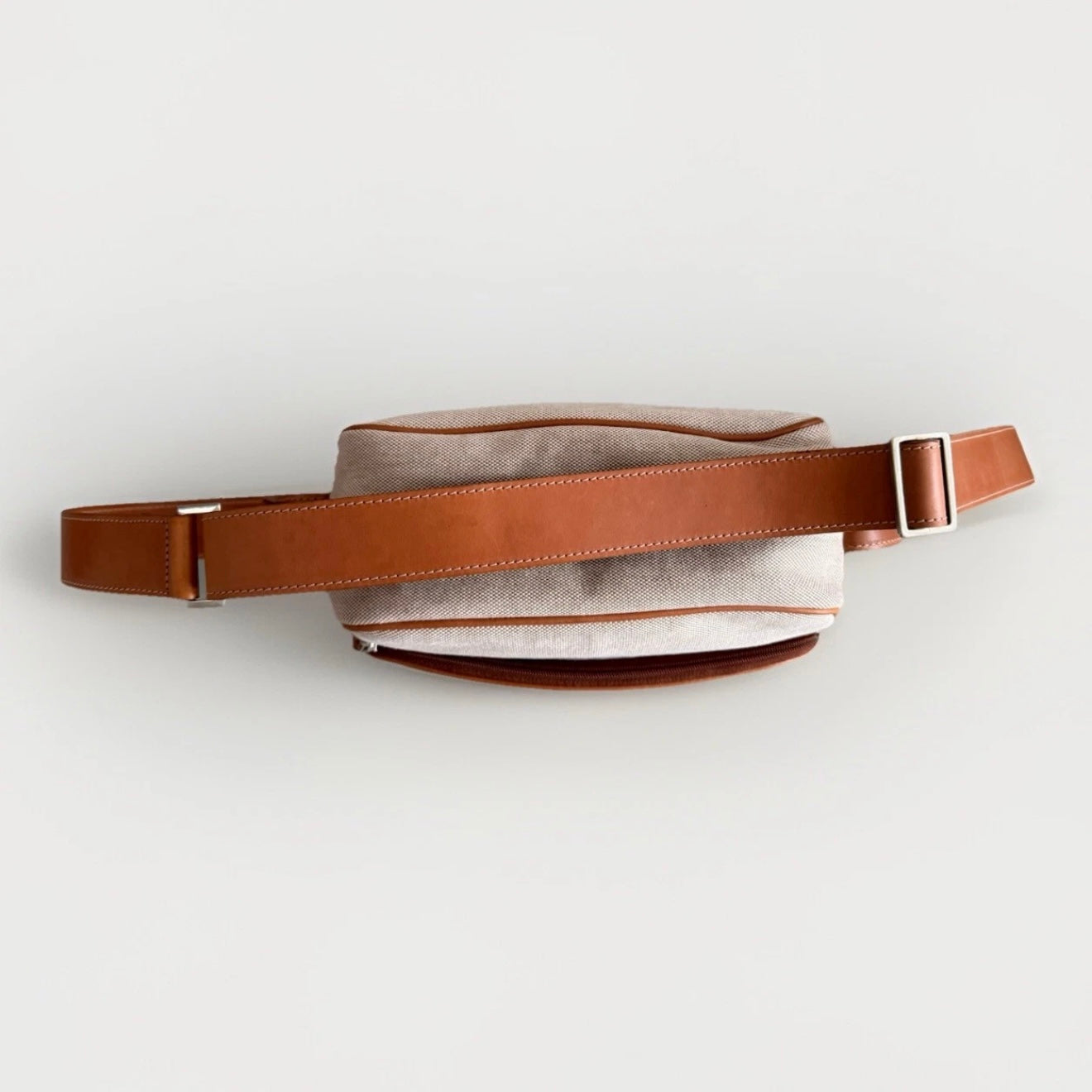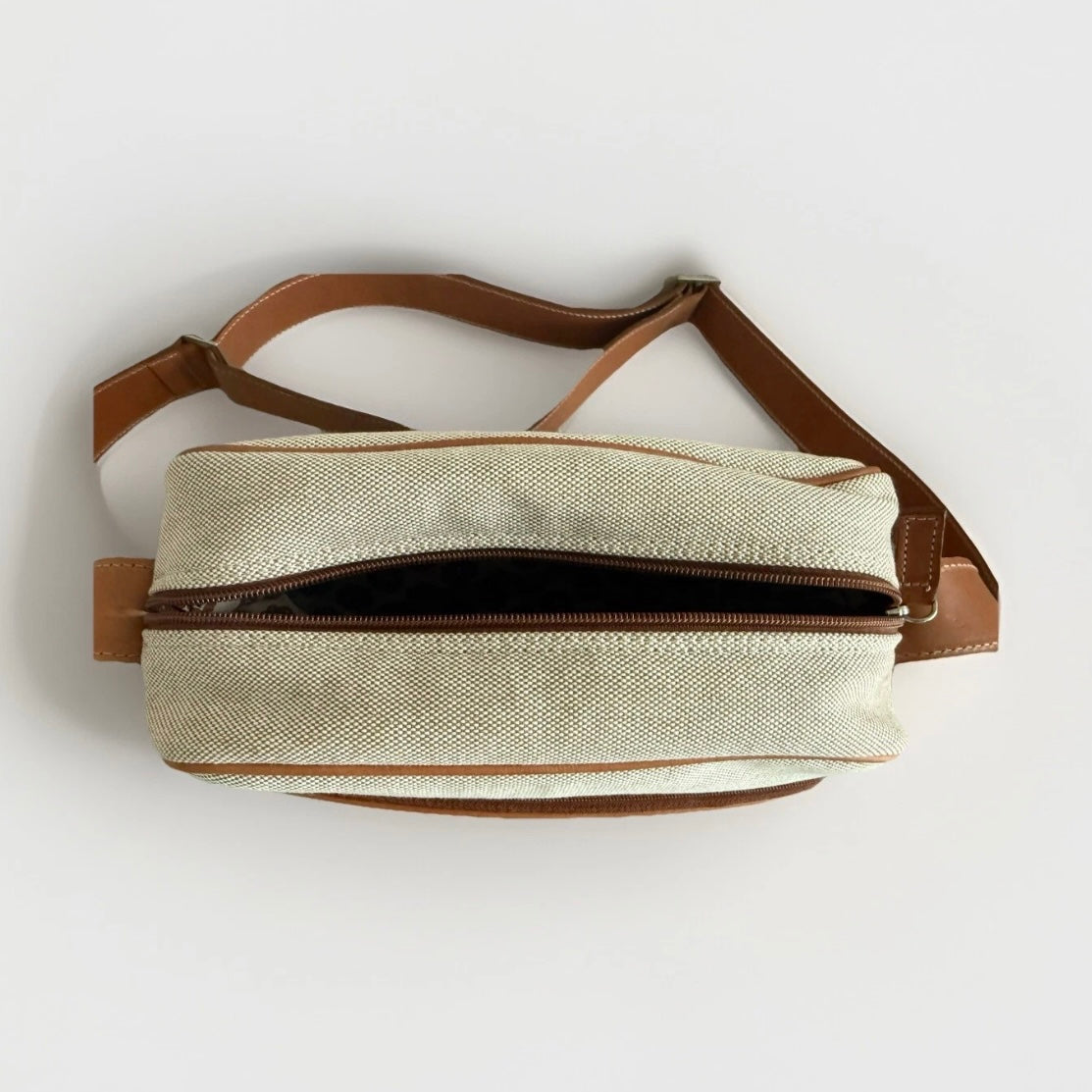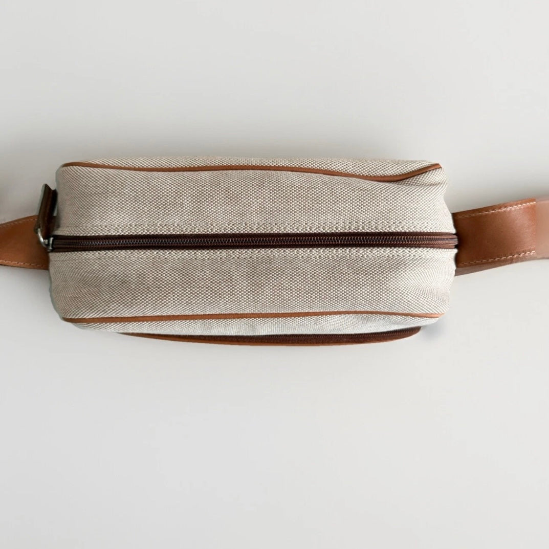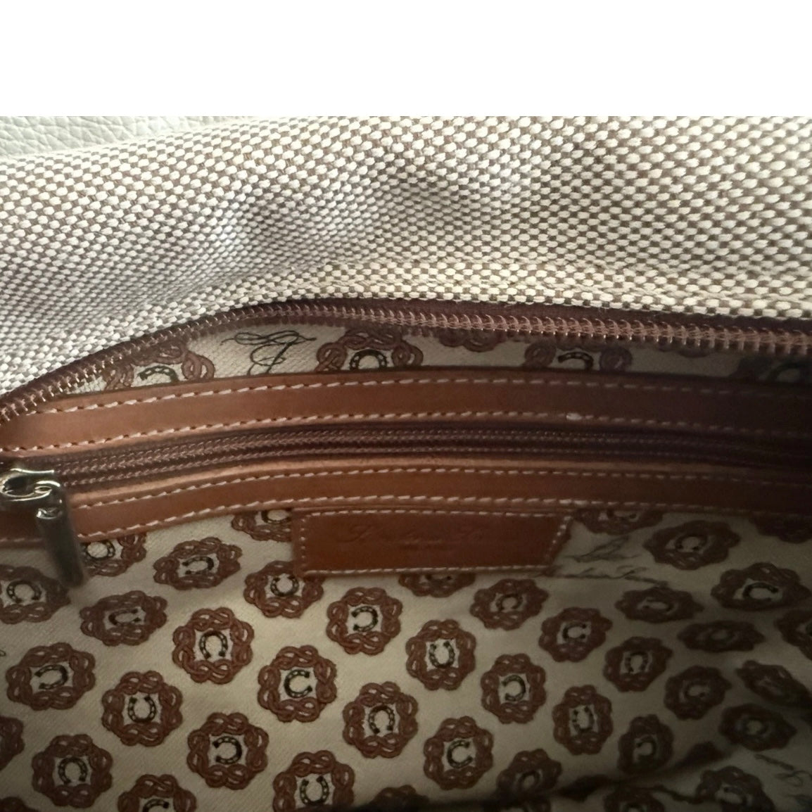 Shopping bag Stivaleria Savoia Milano borsa da portare a spalla, tracolla regolabile in vera pelle vacchetta di colore marrone chiaro e tessuto beige realizzata dall'azienda Dell'Ga che è consederata un must have nel mercato della pelletteria di alta gamma. realizzata da abili pellettieri mediante l'utilizzo di un pellame bovino conciato con tannini vegetali e successivamente tamponato a mano